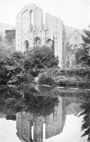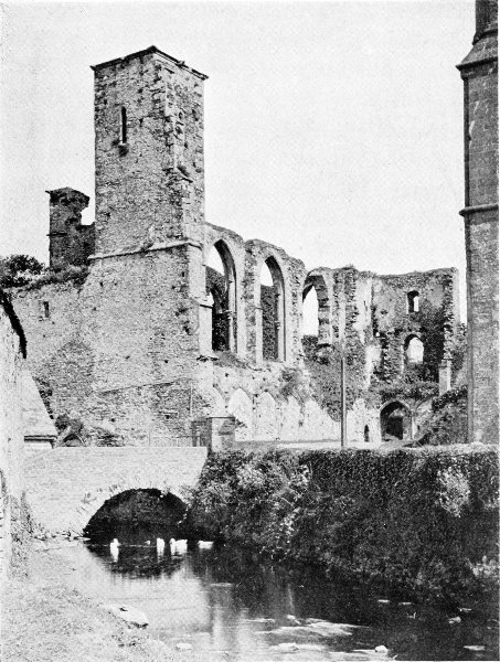 The convent of Clugniac monks in question was built by that notable man Roger de Montgomery, and was the same whose ruins speak so plainly to-day of the ornate tastes of the monks of Clugny. We saw no arcaded walls such as these of the chapter-house, nor richly moulded doorways, nor any such elaborate ornament at Cistercian Buildwas, whose lands marched with the lands of this Priory, and whose monks found the Rule of[Pg 41] Clugny too soft, the tastes of Clugny too enervating. Go to Wenlock in the spring, when its slender columns rise above a sea of sweet-scented flowers, and its old wall is bright with rock-plants—for the Priory stands in private grounds and is cared for like a garden. It is the third religious house that has stood on this spot, for between the days of Milburga, the royal saint, and those of Roger and his Clugniacs, there was another monastery founded here by Leofric of Mercia and his wife Godiva, a well-loved woman whom we are glad to connect with this beautiful spot. The picturesque old Prior’s Lodge is inhabited, and it is only on Tuesdays and Fridays that the world at large is admitted to the ruins. Perhaps nothing recalls to one so vividly the daily life of the monks in this place as the long causeway that stretches across the field near the Priory garden. It was here that the brothers took their daily exercise, raised above the surrounding marsh—a long procession of dark figures, walking slowly to and fro—and among them, unsuspected, that interesting swashbuckler of whom we long to hear more,[Pg 42] that man of extremes whose strange career is all summed up for us in one short, pregnant sentence. “In 1283,” we learn, “a brother of Wenlac became a captain of banditti.” We hear no more of him, alas! except that he was hanged.