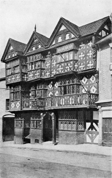 The history of Shrewsbury is stirring, and very, very long. When England was still in the making she stood there on her hill, looking down at the encircling river that has defended her for so many centuries.[Pg 13] Nearly every street is connected in some way with history; every second house is haunted by some great name. Many large and solemn books have been written about Shrewsbury, and not one of them is dull. Even in these few hundred yards between the river and our hotel how many memories there are! As we turn on to the English Bridge to cross the Severn we should glance backwards to the right at the red tower and great west window of the Abbey founded by the Conqueror’s kinsman, Roger de Montgomery, a man of mark; and then, having crossed the steep rise and fall of the bridge, we climb into the heart of the town by the hill called the Wyle Cop. It was up this steep hill that, not so very long ago, the London coach used to dash, turning into the yard of the Lion Hotel at a pace that is still spoken of with awe and admiration. If we were to do the like we should probably have to pay five pounds and costs, so we will ascend the Cop in a way more conducive to dreaming of the past: of Harry Tudor on his way to “trye hys right” at Bosworth, with the welcom[Pg 14]ing citizens strewing flowers before him; of the more stately procession that wound up the hill when he came back as Henry VII. with his Queen and young Prince Arthur; of Robert Dudley, Earl of Leicester, and his stepson Essex, after their reception by bailiffs and aldermen, “and other to the number of xxiiij scarlet gowns, with the scollars of the freescoole,” listening wearily “at the upper end of the Wylde Coppe,” to three orations! Henry Tudor, when he reached the Wyle Cop, was glad to take shelter for the night in that picturesque little black-and-white house with the overhanging top storey and the tiled roof—it is on the left, rather more than half-way up the hill—for he had not won his way into the town without difficulty. “The gates weare shutt against him and the portculleys lett downe,” and a bailiff of the town—“a stout, wise gentleman,” we are told—vowed that Henry should only enter over his prostrate body. So, when Henry had made it clear that he did not mean to hurt the town, “nor none therein,” the only way for the stout, wise gentleman to[Pg 15] keep his word was by lying down on the ground and allowing his future king to step over him. Thus did Henry of Richmond come in triumph to the little house on the Wyle.