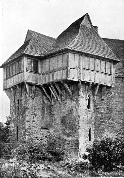 At Onibury we cross the line and the river Onny, and about a mile and a half further on we should begin to look for Stokesay Castle on the left. As it is a little way from the main road, and partly hidden by trees, it is easy to miss it when[Pg 11] travelling at a good pace; but it is perhaps the most attractive ruin in Shropshire from an artist’s point of view, and should on no account be neglected. It is really a fortified house rather than a castle, and the mingling of the warlike with the domestic gives it a peculiar charm. The northern end, with its irregular roof and overhanging upper storey, the “Solar Room,” with its magnificent carved chimney-piece, and even the timbered gateway, are all merely suggestive of a dwelling-house; and it is only when we turn to the curious polygonal tower that we remember how in the old days an Englishman’s house was either very literally his castle or was likely to become some other Englishman’s house at an early date. As far as I know, however, the only time that Stokesay had to make any use of its defences was when it was garrisoned for the King during the Civil War, and on that occasion it seems to have yielded without much ado.