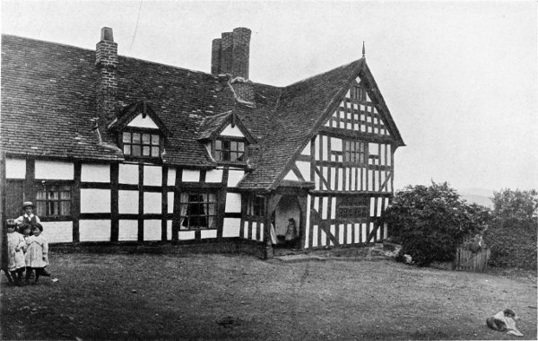 Between Shrewsbury and Whitchurch there is nothing of particular interest except the old farmhouse called Albright Hussey, which stands in a field on the right about three miles out of Shrewsbury. It is a pretty old moated house, partly black-and-white; but its greatest beauty is within, where there is as charming a room as one need wish to see, a room to make a housewife weep tears of covetousness—low, oblong, oak-panelled to the ceiling, with seats in the mullioned windows and a carved fireplace. The house is inhabited, but I believe there is never any difficulty in obtaining leave to see it. Its sixteenth-century walls were once threatened by a party of Parliamentarian horse. There were only eight men to defend the place, but their leader was a crafty man, and shouted his orders aloud within hearing of the[Pg 47] enemy. “Let ten men stay here, and ten go there, and twenty stay with me!” he cried; and the attacking force, dismayed by the number of mythical defenders, rode away and left the stone and timber, the mullioned windows and oaken wainscotes, to be a joy to us to-day.