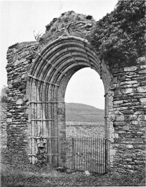 Long ago there was a hermitage at the foot of this “busky hill”; before William[Pg 37] FitzAlan’s monastery for Austin Canons rose here, with the great church that has practically disappeared,[2] and the tall gable with the turrets that are so conspicuous to-day, and the chapter-house with the beautiful doorway. This Abbey was greatly patronised by royalty. Stephen gave it a mill, Matilda gave it lands “for the remission of her sins,” Henry II. gave churches, and Henry III. more land, and Llewelyn of Wales “a moiety of Kenwicke.” The list of other benefactions is endless: mills and fisheries, churches and markets, woods and hogs and herds. Many were the “privileges of flesh and fish” enjoyed by the canons of Haughmond; and Abbot Nicholas, in Edward III.’s time, desiring to make the most of all these luxuries, built a new kitchen for the brethren and “appointed them a cook to dress their food.” It was in 1541 that Henry VIII., as his manner was, took possession of Haughmond and all its riches, “beyng mynded to take the same into his own handes for a better[Pg 38] purpose”; and so the minster, for which he had no use, gradually vanished. Nothing is left of it but a fragment of wall and a doorway. Two tombs that were once within the chancel now lie open to the sky on the hillside, where their appeal for the prayers of the passers-by is of far more pathetic force than it ever was under the shelter of the Abbey’s roof:—