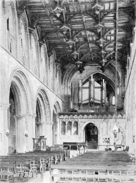 The story of St. Mary’s lovely spire, on our right, is full of incident. In 1572 it was “blown aside by wind”; in 1594 “there fell such a monstrous dry wind, and so extreme fierce ... that the like was never seen of those that be living ... the force whereof removed the upper part of St. Mary’s steeple out of his place towards the south about five inches”; in 1662 the steeple was[Pg 17] “taken down six yards from the top”; in 1690 it was damaged by an earthquake; in 1754 it was “shattered by a high wind”; in 1756 the newly-built part was again “blown aside”; in 1818 the upper part “became loose”; and during a terrific storm in 1894 fifty feet of its masonry fell through the roof of the nave shortly after the evening service. Most wonderfully this last disaster did no damage to the stained glass, which is St. Mary’s great glory and has itself had an eventful existence; for some of it was in old St. Chad’s when it fell, and much of it, long ago, filled the windows of religious houses in Germany.