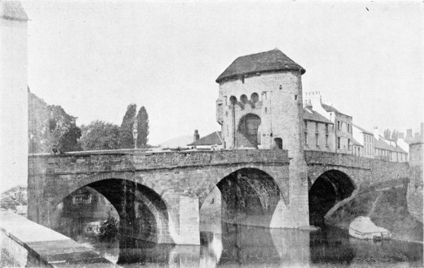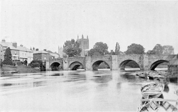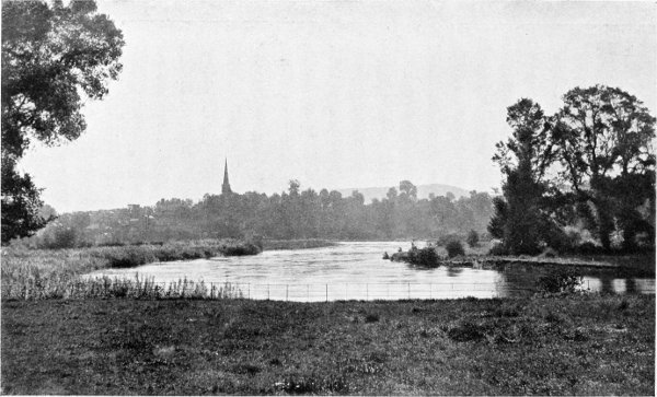 It is by very pleasant ways that this road is leading us—between wooded hills and over quiet streams. The valley narrows[Pg 12] and is at its prettiest near Marshbrook and Little Stretton; then the pointed hill of Caradoc became conspicuous, and beyond it the famous Wrekin appears—famous not for its beauty, but because, being in the centre of the county, it can be seen by nearly every one in Shropshire, and so has gathered round it the sentiment of all Salopian hearts. “To friends all round the Wrekin!” is the famous Shropshire toast, and there, far away to the right, is the isolated rounded hill that means so much to those born within sight of it. At Stretton we leave the hills and wooded valleys behind us, and pass through a few miles of rather dull country. It is at the village of Bayston Hill that we first see, dimly blue against a background of hills, the slender spires—almost unrivalled in beauty—of that fair town which long ago the Welsh named Y Mwythig, the Delight.