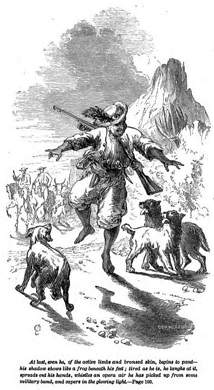 The countenance, however, is far from unpleasing; his voice is odd, with occasional clicks in pronunciation, which May chooses to introduce, notwithstanding his education. The hands and feet are exquisitely small, and the frame lithe and agile as a monkey’s. His costume is copied from his masters; the materials are coarser, but the “wide-awake” hath on him a more jaunty air, the feather a more “knowing” feel, and this is fastened to the hat with a gilt bugle, the gift of some light infantry officer, and much prized by May, who had managed to coax from the same source an old red jacket, which he carries in the waggon-box, and wears on Sundays when they halt in the wilderness.