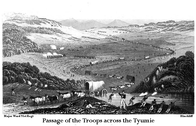 On the 29th of December, 1850, Colonel Somerset attempted to form a junction with Sir Harry Smith, and for this purpose detached a party of one hundred and fifty of the 91st Regiment under Lieut.-Colonel Yarborough, seventy Cape Mounted Rifles under Major Somerset, and a small 3-pounder gun Royal Artillery, but the enemy burst upon the troops in such force that it was deemed necessary to retire; a desperate struggle ensuing between the enemy and the troops, the latter succeeded at length in regaining Fort Hare, but not without lamentable losses on our side.