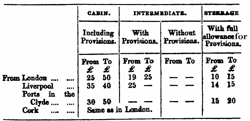 As very many persons who would be most useful in the Colonies have no means of their own for proceeding thither, various provisions have been made to assist them. Thus the Emigration Commissioners “grant passages to those Colonies (only) which provide the necessary funds for the purpose. These funds, which in the Australian Colonies are derived from sales or rents of crown lands, are intended not for the purposes of relief to persons in this country, but to supply the colonists with the particular description of labour of which they stand most in need. New South Wales, South Australia, and the Cape of Good Hope, are at present the only Colonies which supply the means for emigration.”