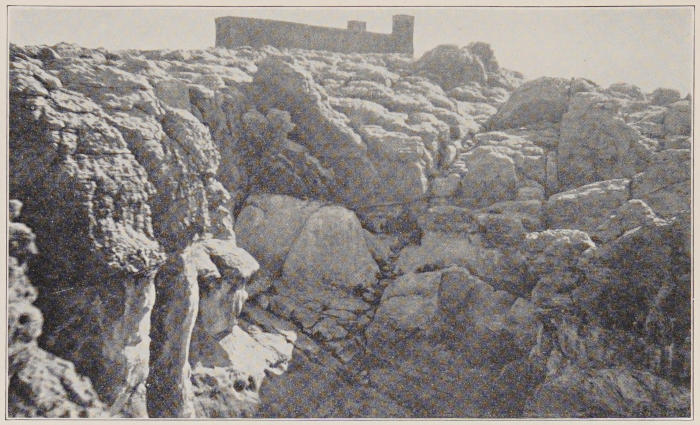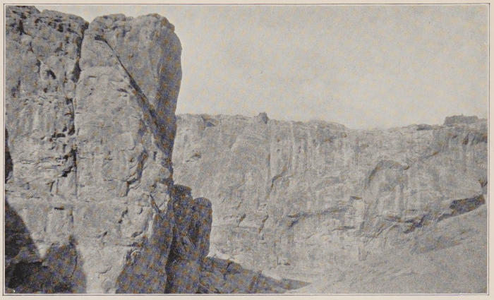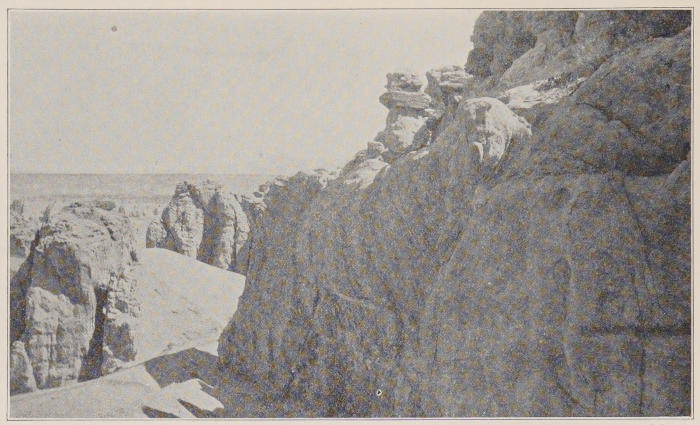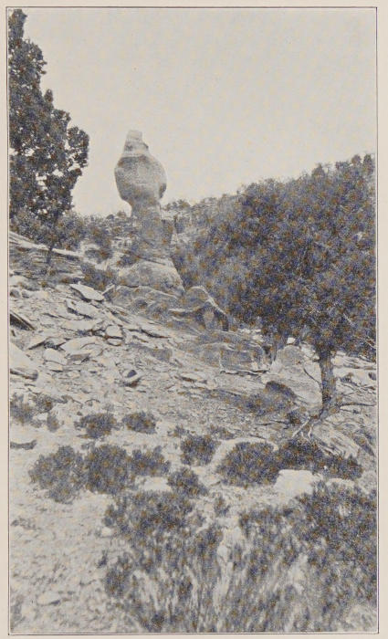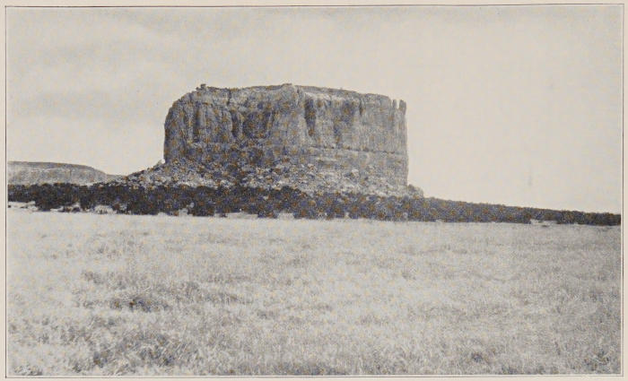 In some far foretime the whole of this vast area was an inland sea. Sand and wind in the long interval since the waters receded have done their part in the task of erosion as effectually as do ocean waves beating upon coast-wise cliffs.[1] The work of these elemental forces is uneven. The softer rock has given[5] way. That which is harder is left sculptured into forms that everywhere invite the imagination. To many of them descriptive names have become permanently attached. Such is Locomotive Rock, lifted high above the road between Casa Blanca and Ácoma in astonishing realism. Most extraordinary is the line of heads and trunks of eleven colossal elephants that may be seen two miles away from Ácoma toward its farm-lands. By wind and sand-blast they have been eroded from the oyster-grey stone to such lifelikeness that fancy grows almost into conviction that here we have the work of forgotten sculptors such as once were bred in Egypt or Chaldæa. Forms like these, in solitudes like these, lead to quick recognition of the source of anthropomorphic worship by the sensitively alert mind of primeval man. Such a portentous figure as that called the Kit Carson monument near Fort Defiance arrests the gaze, bizarre and unlovely though it is. Carved by no human hands, it must have seemed to untutored minds a thing supernatural.