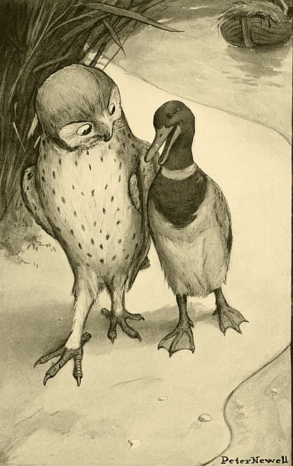 - H13 Pen drawing of Owl and Duck, flirting.