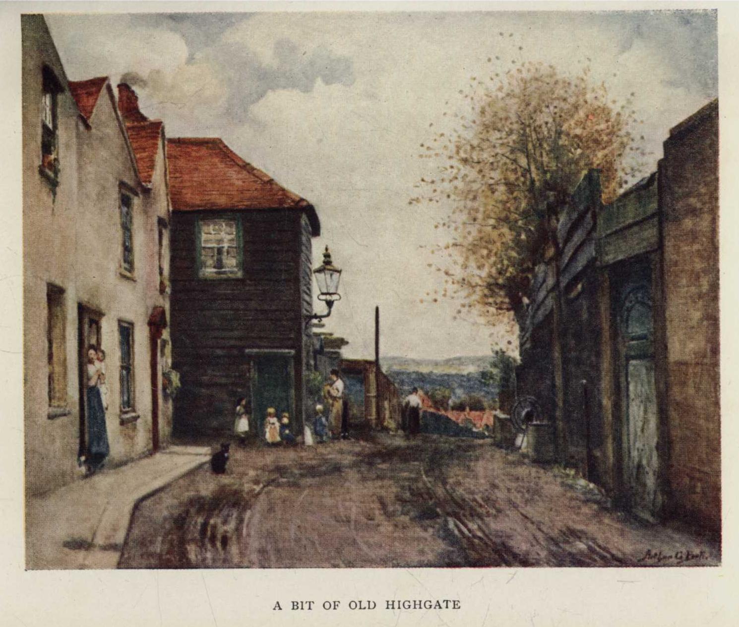 Perched on a hill that is twenty-five feet higher than the loftiest point of Hampstead Heath, Highgate originally commanded as fine a prospect as it, but unfortunately many of the best points of view are now built over, though from the terrace behind the church, and parts of the cemetery, some idea can still be obtained of the beautiful scene that was the delight of Hogarth and of Morland, of Coleridge and Wordsworth, and many other artists and poets who, at one time or another, resided on the hill.