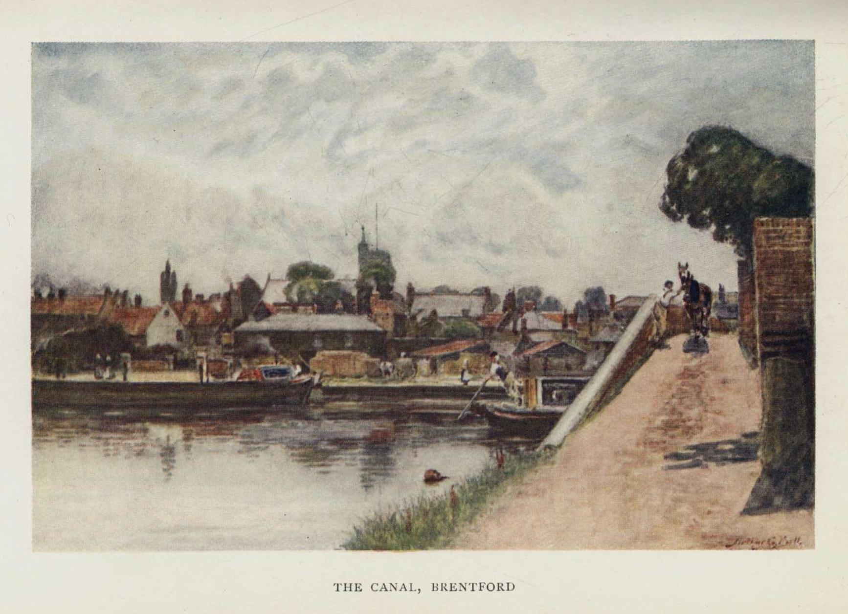 Although actual historical data relating to the bygone days of Hampstead are few, it is possible, with the aid of a little imagination, to call up various pictures of different stages in its long life-story which, even if not strictly accurate in detail, may serve to give a fairly true impression. When, for instance, Ranulph Pevrel brought his bride to the homestead of which he was the chief villein, the whole of the present Heath and the surrounding districts were wild uncultivated lands, with here and there a little clearing representing the sites of the future villages of Highgate, Hendon, Hornsey, Willesden, and Kilburn; whilst deep in the recesses {9} of the woods were many bubbling springs, the fountain-heads of the Holbourne, the name of which is preserved in that of Holborn, also called the river of Wells, because of the many rills that fed it, but generally known as the Fleet, which gave its name to Fleet Road in Haverstock Hill, and Fleet Ditch and Fleet Street in London; the Brent, which joins the Thames at Brentford; the Tybourne, or double brook, so called because its two arms encircle the Isle of Thorney; and the Westbourne, of which the rivulet beside which Godwin built his cell was one of the many tributaries.