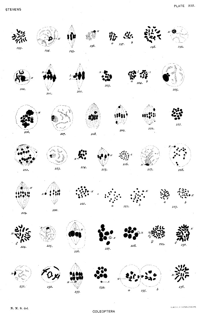 Adalia bipunctata (family Coccinellidæ), the common lady beetle, has a very conspicuous pair of unequal heterochromosomes, as may be[Pg 44] seen in figures 193-197 (plate XIII). This would seem to be a favorable form for determining the chromosome conditions in somatic cells, but no clear equatorial plates were found in either larvæ or pupæ.