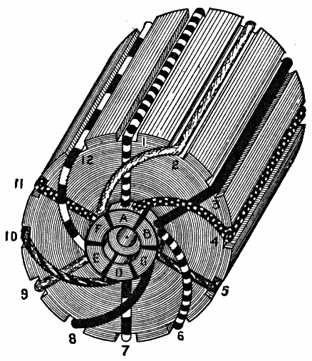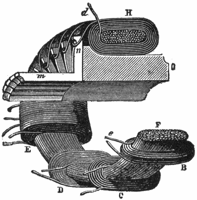Fig. 248.—Early form of Gramme ring armature, the core being shown cut through, and some of the coils displaced to make it clearer. The core, F, consists of a quantity of iron wire wound continuously to form a ring of the shape shown by the section. Over this is wound about thirty coils of insulated copper wire, B C D, etc., the direction of the winding of each being the same, and their adjacent ends connected together. The commutator segments consist of a corresponding number of brass angle pieces, m, n, which are fixed against the wooden boss, o, carried on the driving shaft. The junction of every two adjacent coils is connected to one of the commutator segments, as shown at n.