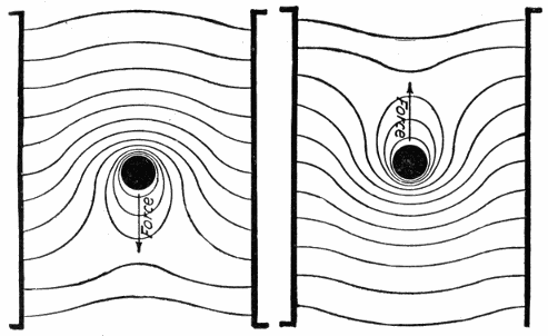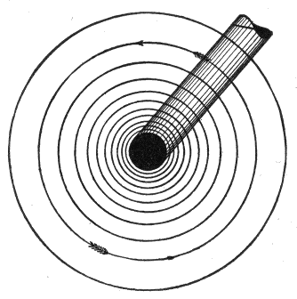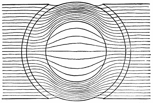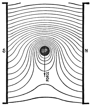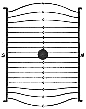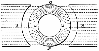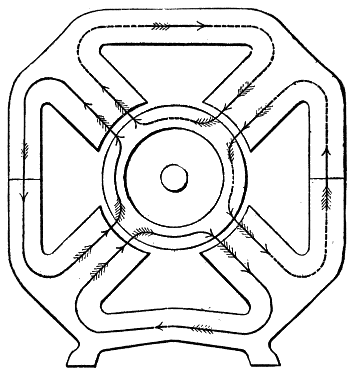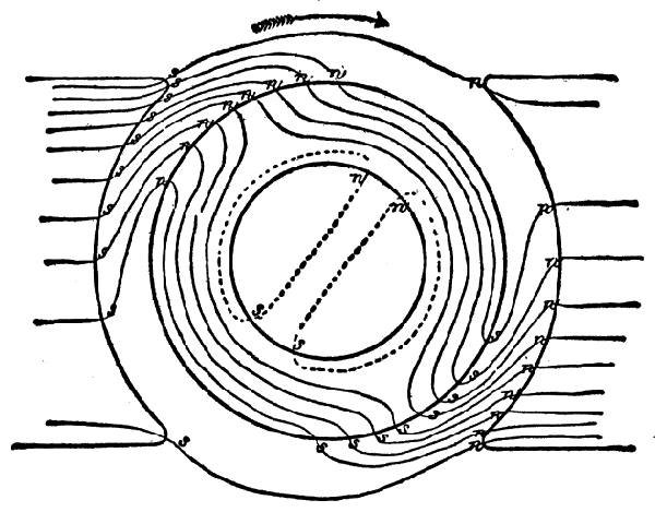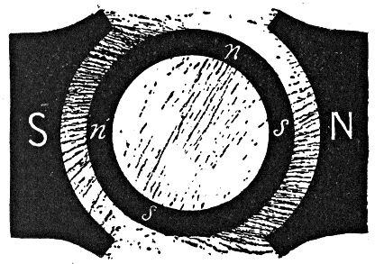 Fig. 250.—Distribution of magnetic lines of force through a Gramme ring. Since the metal of the ring furnishes a path of least reluctance, most of the magnetic lines will follow the metal of the ring and very few will penetrate into the aperture of the interior. This condition causes a serious defect in the action of ring armatures rendering the winding around the interior useless for the production of electromotive force. Hence, in ring armatures only about half of the winding is effective, the rest or "dead wire," adding its resistance to the circuit, thus decreasing the efficiency of the machine.