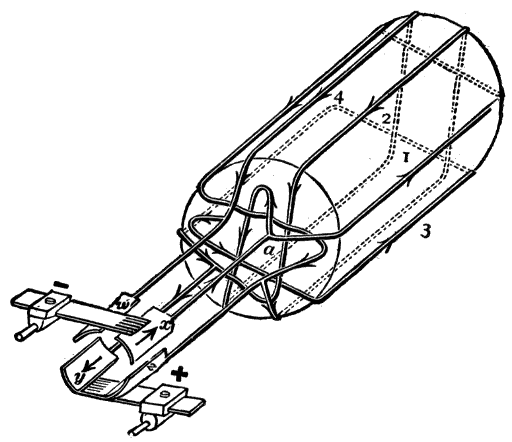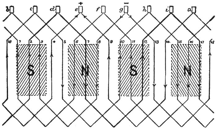 Fig. 252 shows an elementary four coil drum armature. Starting from the point a and following the winding around without reference at first to the commutator, it will be found that the rectangular turns of the wire form a closed circuit, and are electrically in series with one another in the order of the numbers marked on them.