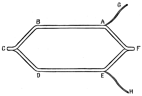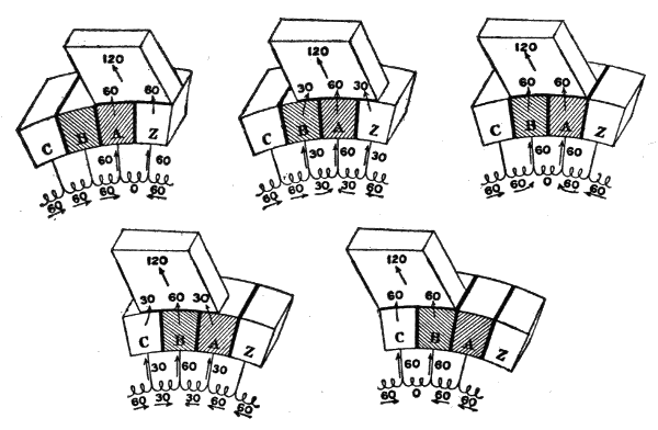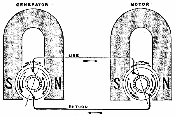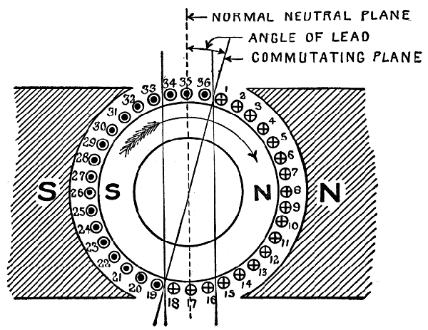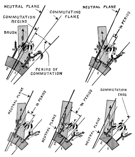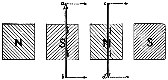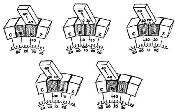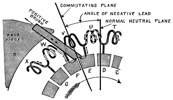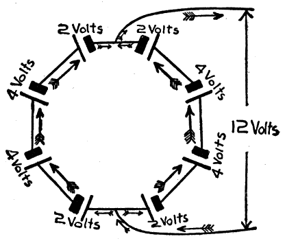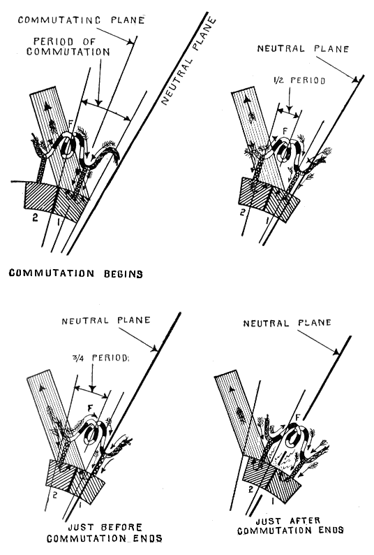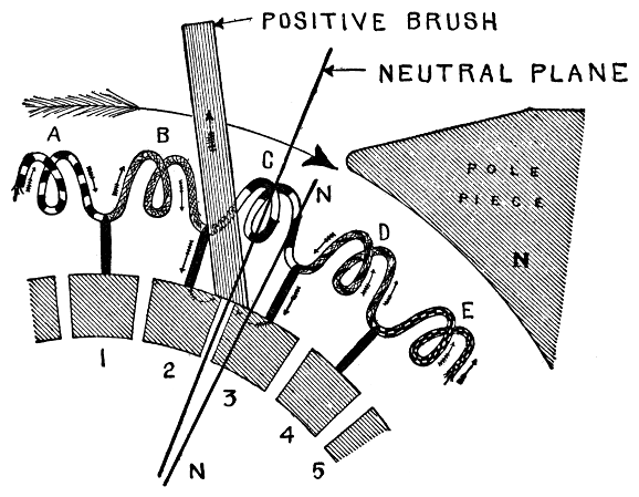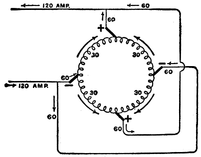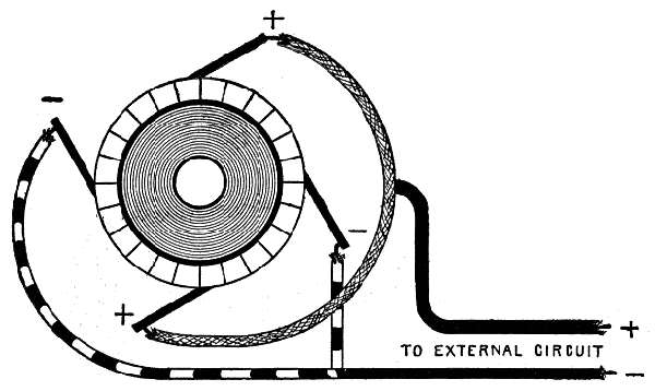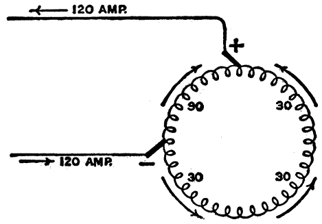 With respect to the connections to the four segments w, x, y, z, of the commutator it will be found that at two of these, x and y, the pressures in the windings are both directed from, or both directed toward the junction with the connecting wire. At the other two segments, z and w, one pressure is toward the junction and the other directed from it. If, therefore, the brushes be placed on x and y they will supply current to an external circuit, z and w, for the moment being idle segments.