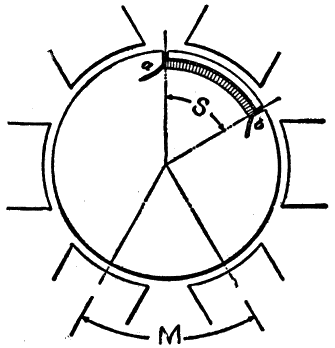 Fig. 253.—Disc armature of Niaudet. It is equivalent to a ring armature, having the coils turned through an angle of 90°, so that all the coils lie in a plane perpendicular to the axis of rotation. The connections of the coils with each other and with the commutator remain the same, the beginning and the end of adjacent coils leading to a common commutator bar as shown. The magnetic field is arranged by the use of two magnets, so arranged as to present the north pole of one to the south pole of the other, and vice versa. In the figure one of these magnets is considered as above the paper, and the other below. If this armature be rotated through the magnetic field as shown, a reversal of current takes place in each coil, when it is in such a position that one of its diameters coincides with the pole line, NS. If the brushes be set so as to short circuit the coils that are in this position, the armature will be divided into two branchings, the current flowing in an opposite direction in each, and a direct current will flow in the exterior circuit.