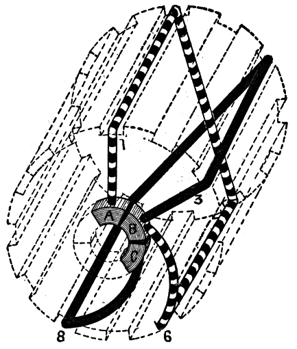 In the radial diagram the inductors of the armature are represented by short radial lines, while the end connectors are represented by curves or zigzags, those at one end of the armature being drawn within, those at the other end, without the circumference of the armature. With the radial diagram it is easier to follow the circuits and to distinguish the back and front pitch of the winding.
