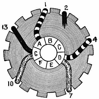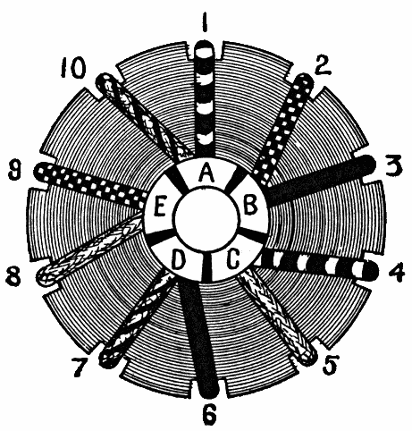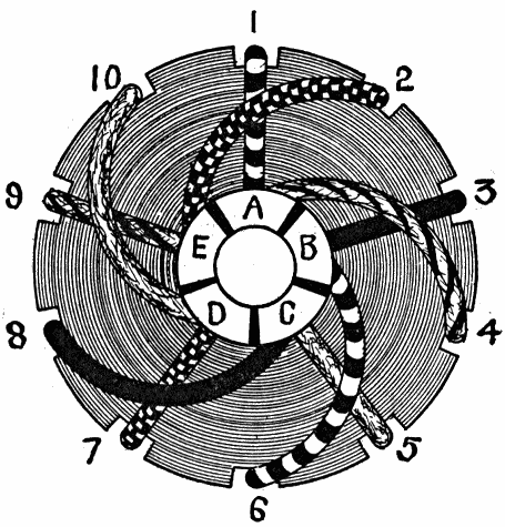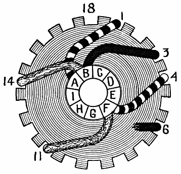 Fig. 254.—End of ring winding for a four pole machine. An end view is simply a view showing the arrangement of the armature inductors and connections looking from the front or commutator end. A developed view of the above winding is shown in fig. 257.