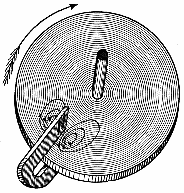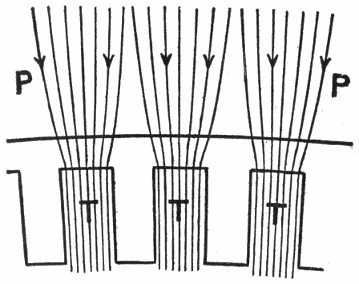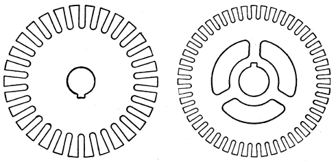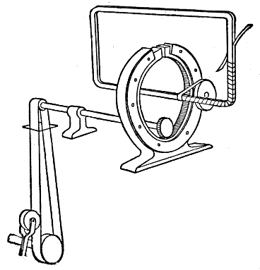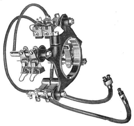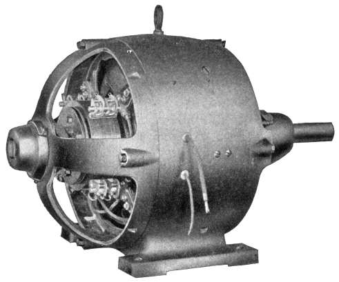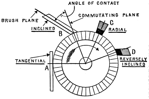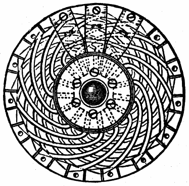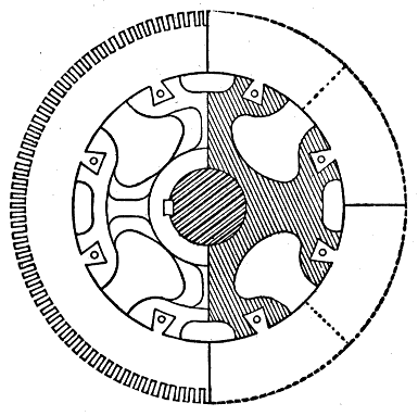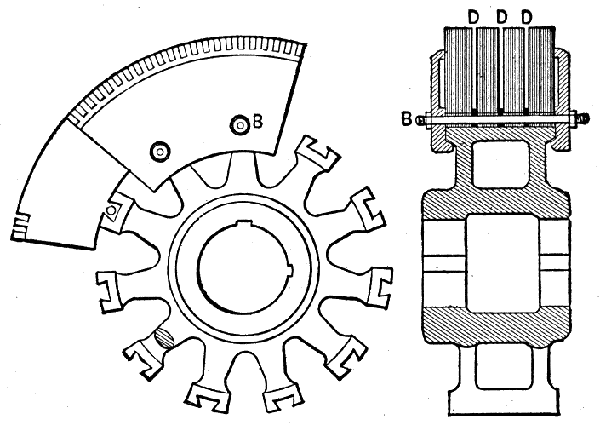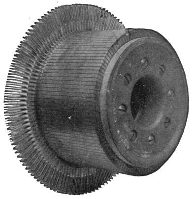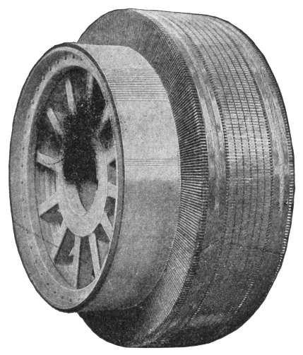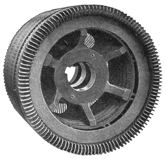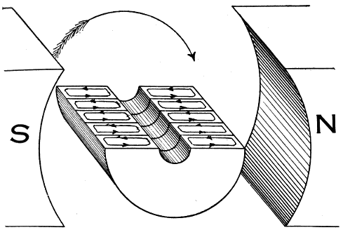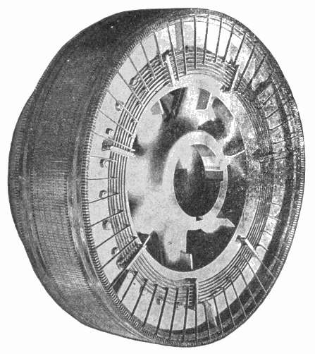 Disc Armatures.—The inductors of a disc armature move in a plane, perpendicular to the direction of the lines of force, about an axis parallel to them as shown in fig. 253. The main difficulty with this type has been in constructing it so that it will be strong and capable of resisting wear and tear. It was introduced in an effort to avoid the losses due to eddy currents and hysteresis present in the other types of armature.