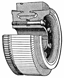 Fig. 249.—Modern form of Gramme ring armature. The core consists of a number of thin flat rings of well annealed charcoal iron, the outer diameter of each ring or disc being 11½ inches, and its inner diameter 9¼ inches. Sheets of thin paper insulate each disc from its neighbors to prevent the flow of eddy currents. The armature is mounted on a steel shaft to which is keyed a four armed metal "spider," the extremities of whose arms fit into notches cut in the inner edges of the soft iron core rings, so that a good mechanical connection is obtained between the core and the shaft. The spider is made of a non-magnetic metal, to reduce the tendency to leakage of lines of force across the interior of the armature. The armature inductors consist of cotton covered copper wire of No. 9 standard wire gauge, wound around the core in one layer, and offering a resistance, from brush to brush, of 0.048 ohm. There are two convolutions in each section, the adjacent ends of neighboring sections being soldered to radial lugs projecting from the commutator bars.