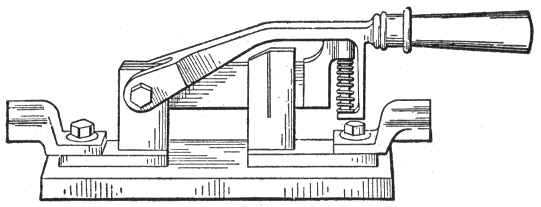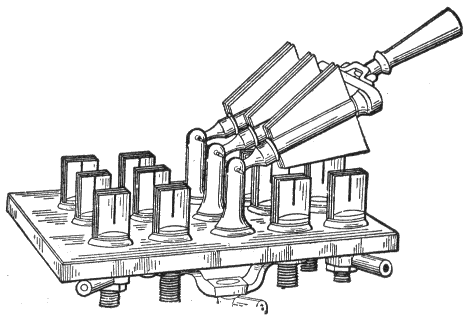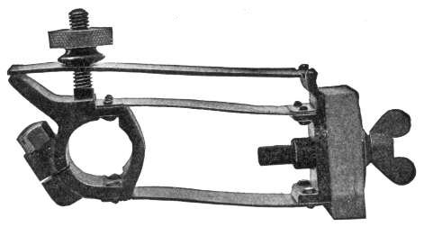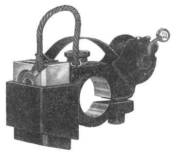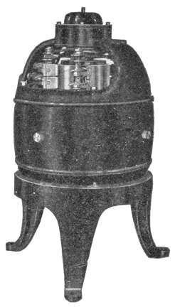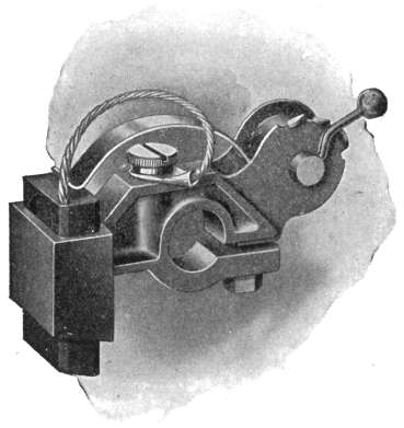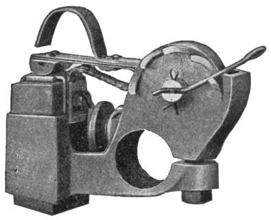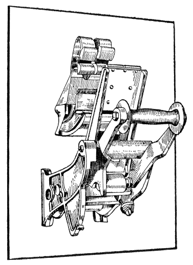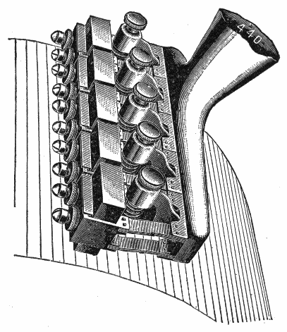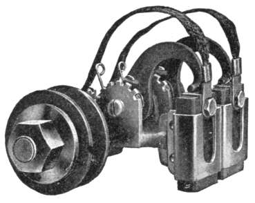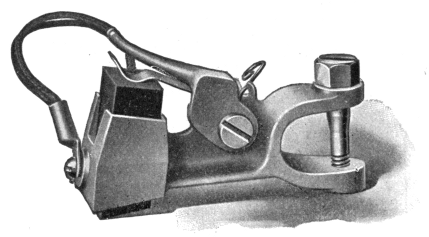 Fig. 502.—Roller-Smith, single-pole, plain overload circuit breaker. As its name indicates, the function of the plain overload circuit breaker is to automatically interrupt the circuit in which it is placed when the flow of current through it exceeds the predetermined limit for which the apparatus is set. It is the most common of all of the types and is utilized for the protection of dynamos and motors and all other electrical apparatus which, by reason of the conditions of operation, may become subject to loads in excess of the normal. The single-pole type may be used separately for the protection of a single wire of a given circuit or grouped to protect the two or more wires of one circuit, becoming in the latter case the so called independent arm multi-pole apparatus. The action of this type of circuit breaker is fully explained in fig. 491.