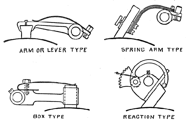 Ans. There are numerous types. It may consist of a clockwork device, a weight acting on a small drum or pulley,421 a modified dash pot arrangement, or a device operating by the expansion of a conductor due to the heat generated by a current passing through it.