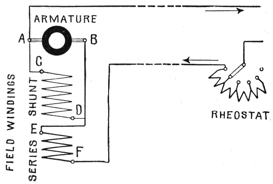Fig. 498.—Simplified diagram of the connections of starter connected to compound motor as shown in fig. 497.