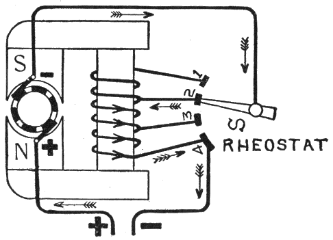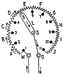 Ans. In fig. 493, resistance coils, A, B, C, etc., are mounted in a frame or box, and are connected at intervals to the contacts 1, 2, 3, etc. The rheostat arm or lever L is pivoted at S, and when moved over the contacts, inserts more or less of the resistance in the circuit thus regulating the flow of the current. One terminal M of the rheostat is connected to the first contact and the other terminal O, to the lever at S.