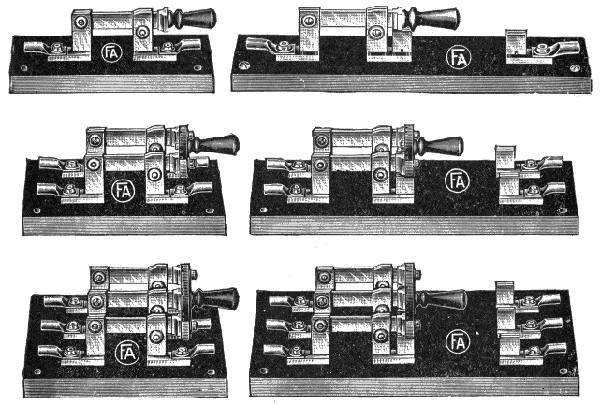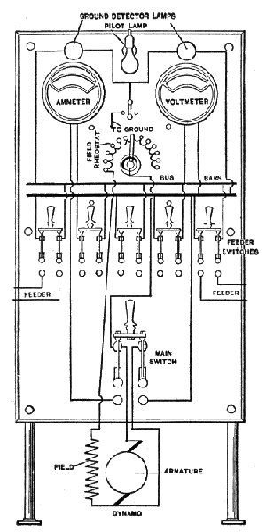 Switchboards.—A switchboard consists of a panel or series of panels of slate, marble, soapstone or brick tile erected in an electric plant for the purpose of mounting in a convenient group the instruments for controlling and distributing the current and safeguarding the system. Switchboards may be divided according to operation into two classes: