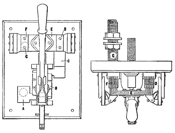 Figs. 489 and 490.—Front and top views of I-T-E automatic overload circuit breaker. In fig. 489 the current in the circuit enters at A, passes through the solenoid coil B (which in its iron jacket becomes a powerful magnet), through the copper terminal C, to the contact blades D, across the bridge at E to the contact blades F, and out into the line at G. The path of the current as indicated above is more clearly indicated in the top view fig. 490. When the current in the solenoid coil produces sufficient magnetism to overcome the weight of the plunger, the latter is drawn up with constantly increasing velocity until it strikes a restraining latch or trigger which forces the arm out of the switch, thus automatically opening the circuit. The device is so constructed that in opening the circuit the arc is broken on the carbon contacts instead of the copper contacts.