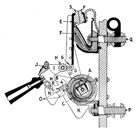 Fig. 491.—Roller-Smith "S.E." plain overload circuit breaker. In operation, current entering through the lower studs flows through the laminated strap windings C, from this into the arm D, through the contact plate E, into the stationary brush F, and finally out through the upper stud Q. In its passage through the laminated windings C, the square core A is of course magnetized to a degree dependent on the current strength. When this magnetization reaches a predetermined value, the attraction exerted on the ends K of the pivoted armature causes the same to rise with great and increasing velocity, finally bringing the finger D which forms part of the armature into violent contact with the face R of the corresponding projection on the housing which carries the handle and the roller H. This heavy blow causes H, in its rotation about the shaft J, to go over the center and consequently allows the strong outward pressure of the brush F and the resilient coil C to throw the arm outward with a high velocity and so break the circuit, first between the brush fingers and the contact plate and finally between the carbons S and F, the one of which is rigidly secured to the arm and the other of which is resiliently mounted on its supporting spring. To reset the breaker, the handle, which the act of opening has raised, is pulled down, thus bringing roller H into engagement with roller G once more and in that way forcing the arm back into its initial position.