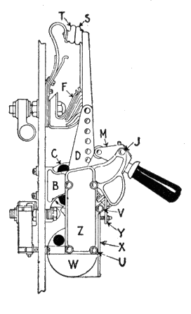Fig. 492.—Roller-Smith "S.E." combination overload and underload circuit breaker. Attached to the supporting frame B is the extension Z, which like B, is of non-magnetic material and carries a rectangular magnetic core around which there are wrapped laminated copper conductors. Hinged at U is a heavy cup-shaped mass of magnetic material, and hinged at V is a flat lever X which bears against the extension Y secured to the housing which carries the operating handle. The circuit through the breaker conveys the current around the windings of this underload coil carried by frame Z and passes from it to the regular overload winding C from which it pursues the same course and exercises the same function as in a plain overload breaker. The core of Z being thus magnetized, the cup-shaped member W is held in firm contact therewith and the lever X hangs free. Should, however, the current fall below the minimum value, W is no longer sustained by the magnetic attraction but drops away, swinging on its hinge U until the projection on the heel thereof strikes the lever X, which blow is transmitted through Y to the handle and thus trips the breaker. When closing to reset the breaker, the handle is manipulated just as in the case of a plain overload breaker, that is, it is pulled down, thus not only closing and locking the breaker as before but through the pressure exerted by Y on X and by X on W, putting the latter into contact with its rectangular core to which it will adhere if the necessary current be present.