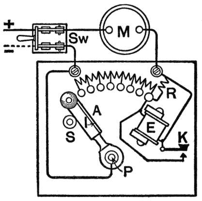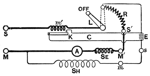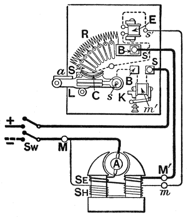 Fig. 497.—Starter with no voltage release and overload release connected to a compound motor. With a shunt motor, the only difference in the diagram would be that the series winding Se would be absent, and the armature A would then be connected straight across between the main terminals M and M'. When switch Sw is closed, the current will enter the starter at its terminal S, and pass through the magnet coil m' of the overload release to the switch lever L, which is shown in the off position. As soon as L is moved up to make contact with the first contact S the current divides; part going through the resistance R and the terminals S' and M' to the series coil Se (if a compound motor) and armature A; and part through the no voltage magnet E to the shunt winding Sh. As the lever L is moved up toward E, the effect is to take R out of the armature circuit and put it into the shunt circuit. When the iron armature a, fixed on the switch lever, comes against the poles of E, the laminated copper brush C bears against the blocks B, B, and so affords a better path for the current than through the spindle s. Should the supply voltage fail, either temporarily or permanently, E will release a, and L will fly off under the tension of a helical spring coiled round s. If there should be an overload on the motor, tending to pull it up and cause an excess of current to flow through the armature; this excess current, passing through m', will make it attract its armature, so bringing two contacts together at K which will short circuit E, and allow the switch to fly off. The connections between E and m' are not shown in the figure, but they are indicated at C in fig. 498, which is a simplification of fig. 497, and which should be carefully compared therewith. When only the normal current is flowing, the attraction between m' and its armature is not sufficient to pull the latter up. The actual forms and arrangement of parts on the starters are well shown in some of the figures.