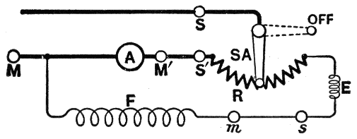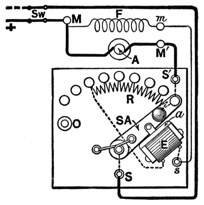 Fig. 495.—Starter with no voltage release for a shunt motor. The terminals of the motor are at M, M', m, and those of the starter at S, S', s. The lever SA is shown in the "on" position. The current enters the motor at the terminal M, and there divides, part going through the field coil F, and the main current through the motor armature A. The armature current enters the starter at the terminal S', and traversing the lever SA, leaves by the terminal S. The field current enters the starter at the terminal s, traverses the coil of the magnet E (which holds up the armature a linked to the lever) and thence completes its journey through the whole of the resistance R, and through the lever SA, to the terminal S. When the supply is cut off by opening Sw, or should the field circuit be accidentally broken, the magnet E will release a and the lever, which will thereupon fly to the "off" stop O. It should be noticed that when SA is off, A and F form a closed circuit with the resistance R and magnet E. The inductance of F has consequently no chance of causing destructive sparking when the current is shut off. In starting the motor, Sw is first closed, and then, as the lever is slowly moved, the resistance R, which at first is all in circuit with A, is gradually transferred from A to F. The resistance of R is too small to affect appreciably the current in F, which necessarily consists of a comparatively large number of turns of fine wire. The arrangement is adopted to render the breaking of the shunt circuit unnecessary and is rendered clearer by the diagram fig. 496. It should be noted that E may be provided with a short circuiting key or push if required.