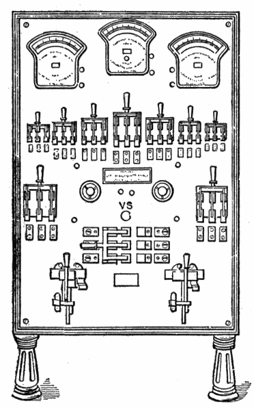 Ans. Fig. 500 shows one suitable for two dynamos. At the top is a voltmeter and two ammeters. Immediately below is a row of feeder switches serving to connect and disconnect the 429 various feeders with and from the bus bars which are mounted behind the board. Below are two rheostat handwheels, and two large switches connecting the dynamos with the bus bars. V S is a voltmeter switch connecting the voltmeter with various parts of the system. Below the voltmeter switch is a double-throw switch to transfer the bus bars from connection with the dynamo switches to one with some other source of current such as a street circuit, in the event of a breakdown. At the bottom are two circuit breakers.