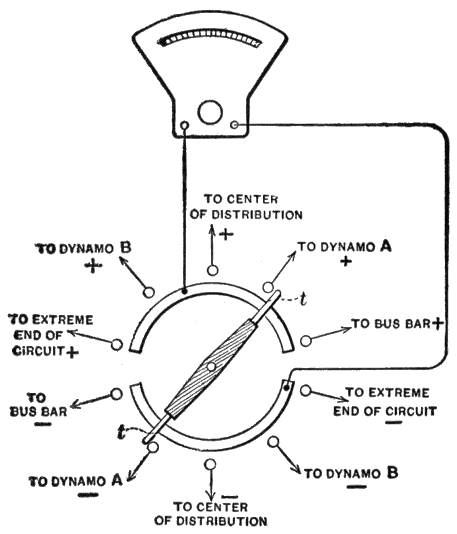 Under ordinary conditions it remains connected to the circuit at the central point of distribution. When one dynamo is already in circuit, however, and it becomes necessary to connect up the other one, the voltage of the latter must be the same as that at the bus bars. Accordingly, connections are provided to the voltmeter switch such that the attendant can compare the voltages at the dynamo terminals and bus bars before closing the dynamo switch. All the positive connections are on one side of the circle swept by the switch and all the negative connections on the other side.