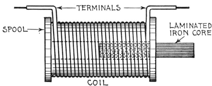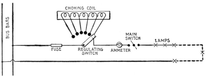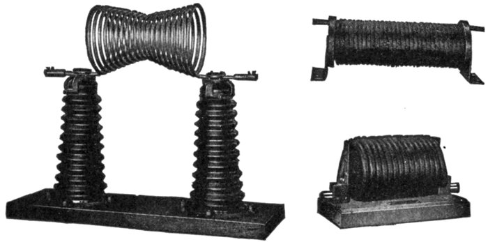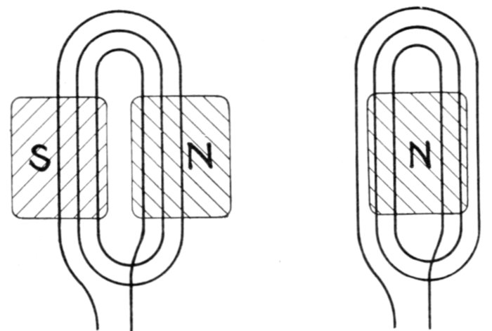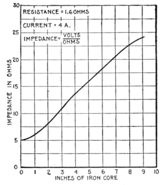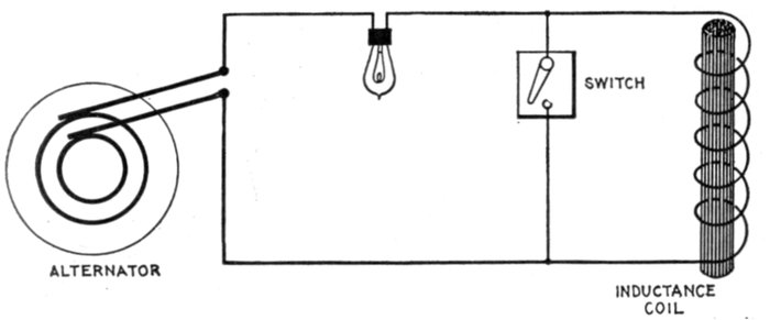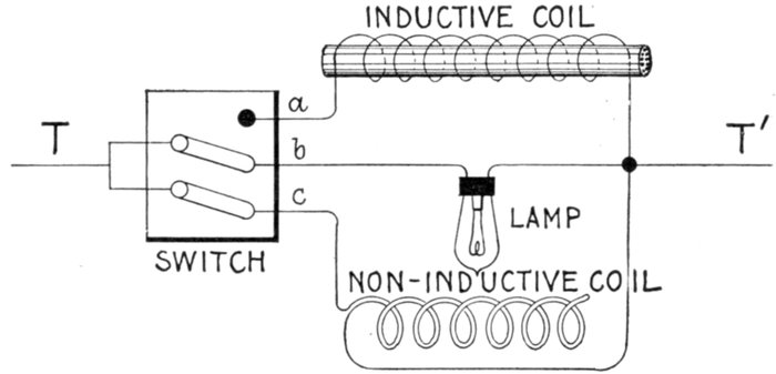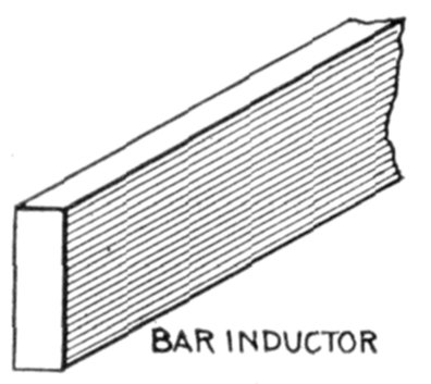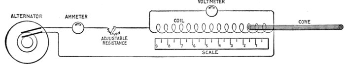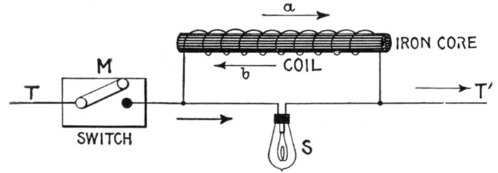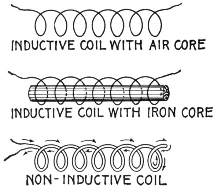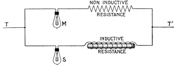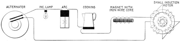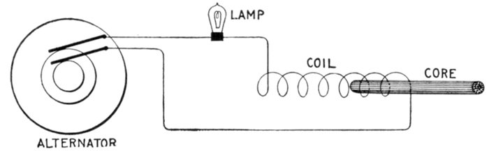 Figs. 1,213 to 1,217.—Apparatus which operates successfully on an alternating circuit. The alternating current will operate incandescent lamps, arc lamps, electric heating apparatus, alternating current motors. It will flow through a straight wire with slightly increased retarding effect, but if the wire be wound on an iron bar its strength is greatly reduced.