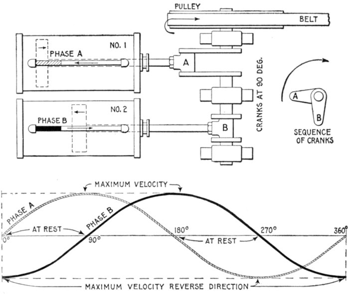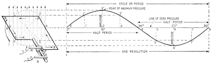 Fig. 1,225.—Diagram illustrating "phase." In wave, vibratory, and simple harmonic motion, phase may be defined as: the portion of one complete vibration, measured either in angle or in time, that any moving point has executed.