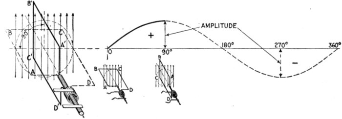 Fig. 1,222.—Diagram illustrating amplitude of the current. The current reaches its amplitude or maximum value in one quarter period from its point of zero value, as, for instance, while the generating loop moves from position ABCD to A'B'C'D'. At three-quarter revolution, the current reaches its maximum value in the opposite direction.