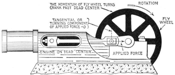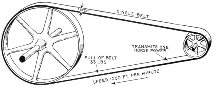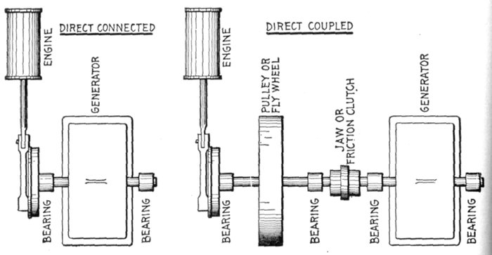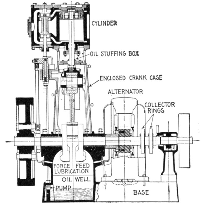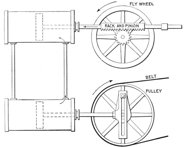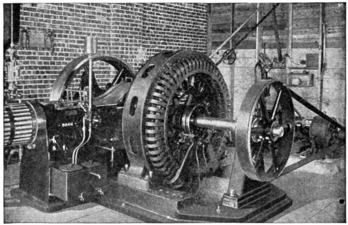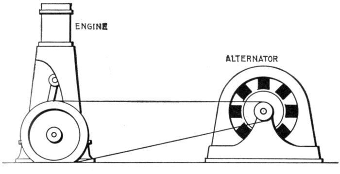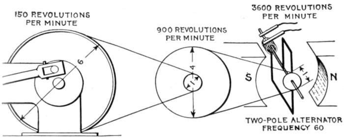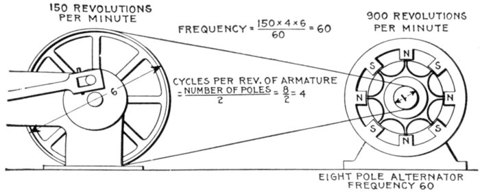 Fig. 1,223.—Diagram of alternator and engine, illustrating frequency. The frequency or cycles per second is equal to the revolution of armature per second multiplied by one-half the number of poles per phase. In the figure the armature makes 6 revolutions to one of the engine; one-half the number of poles = 8 ÷ 2 = 4, hence frequency = (150 × 4 × 6) ÷ 60 = 60. The expression in the parenthesis gives the cycles per minute, and dividing by 60, the cycles per second.