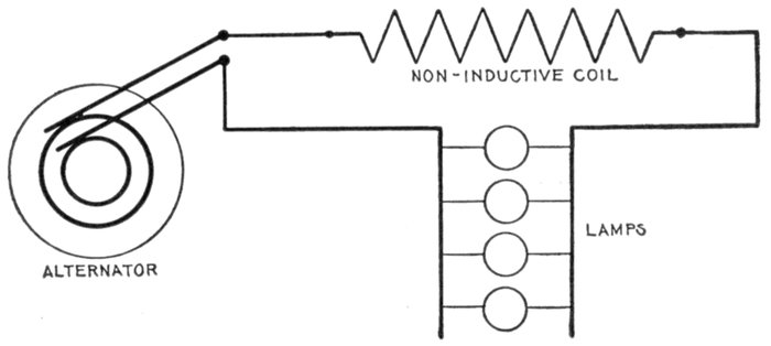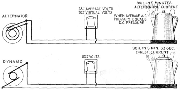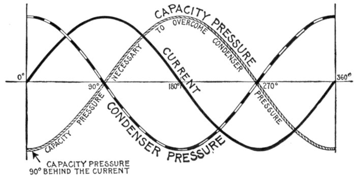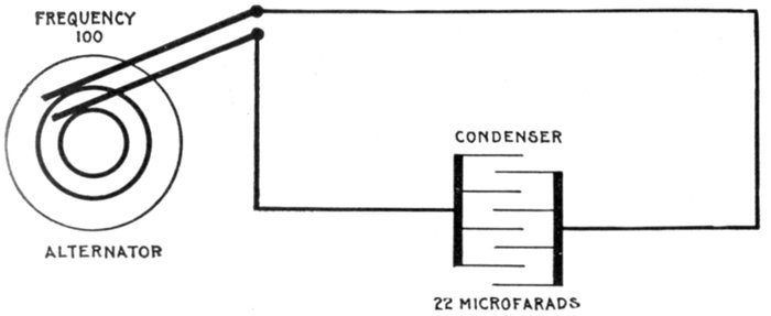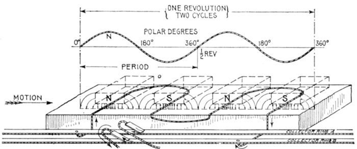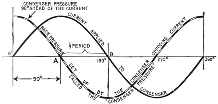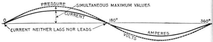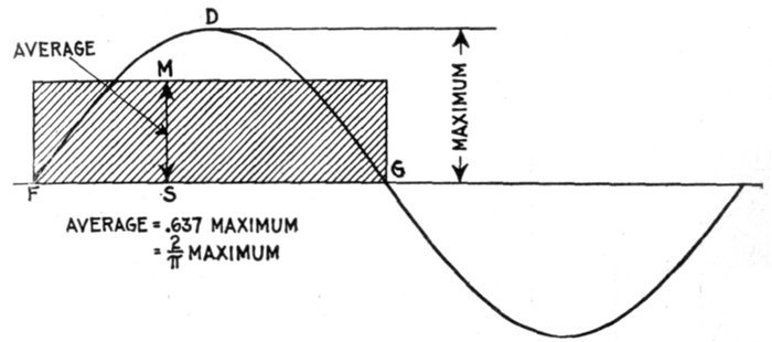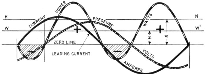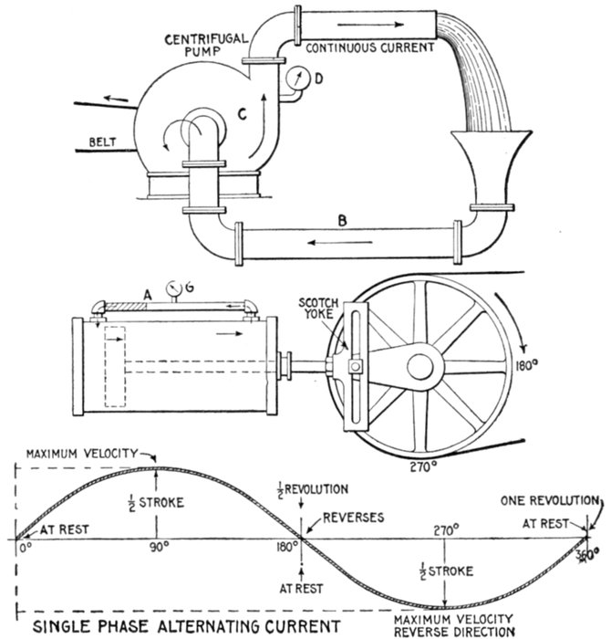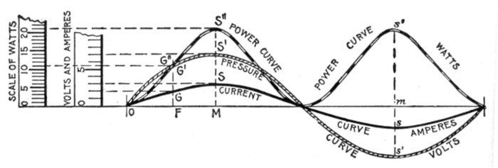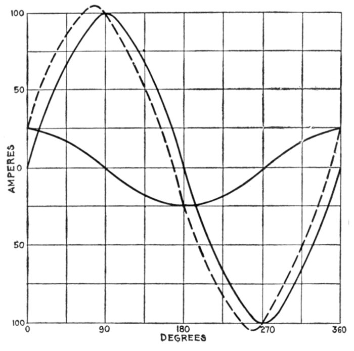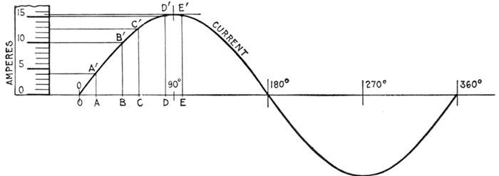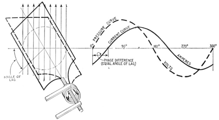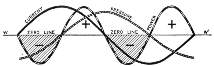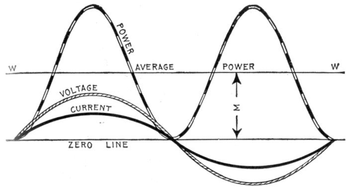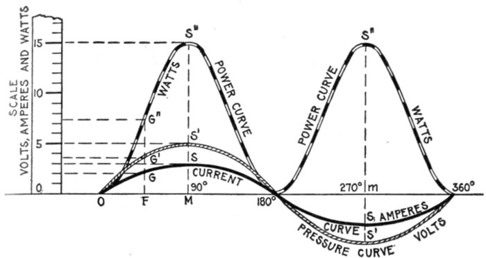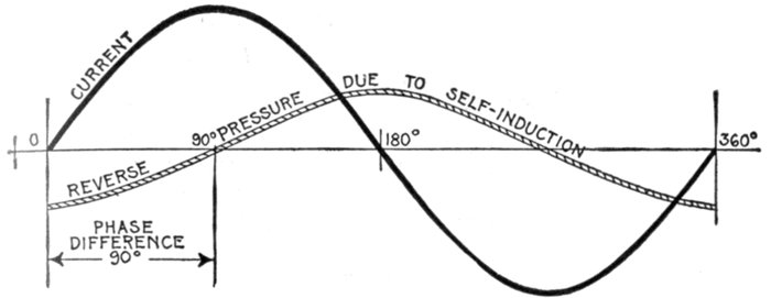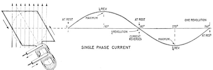 The alternating current, as has been explained, rises from zero to a maximum, falls to zero, reverses its direction, attains a maximum in the new direction, and again returns to zero; this comprises the cycle.