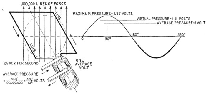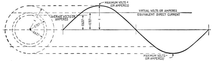 Alternating Current Principles.—In the operation of a direct current generator or dynamo, as explained in Chapter XIII, alternating currents are generated in the armature winding and are changed into direct current by the action of the commutator. It was therefore necessary in that chapter, in presenting the basic principles of the dynamo, to explain the generation of alternating currents at length, and the graphic method of representing the alternating current cycle by the sine curve. In order to avoid unnecessary repetition, the reader should carefully review the above mentioned chapter before continuing further. The diagram fig. 168, showing the construction and application of the sine curve to the alternating current, is however for convenience here shown enlarged (fig. 1,218). In the diagram the various alternating current terms are graphically defined.
