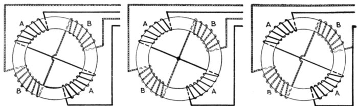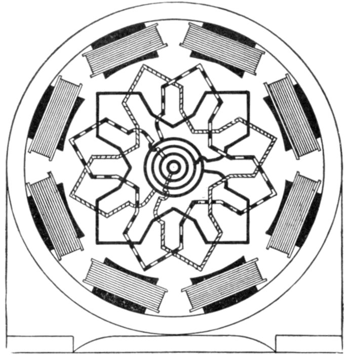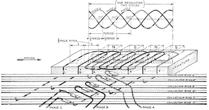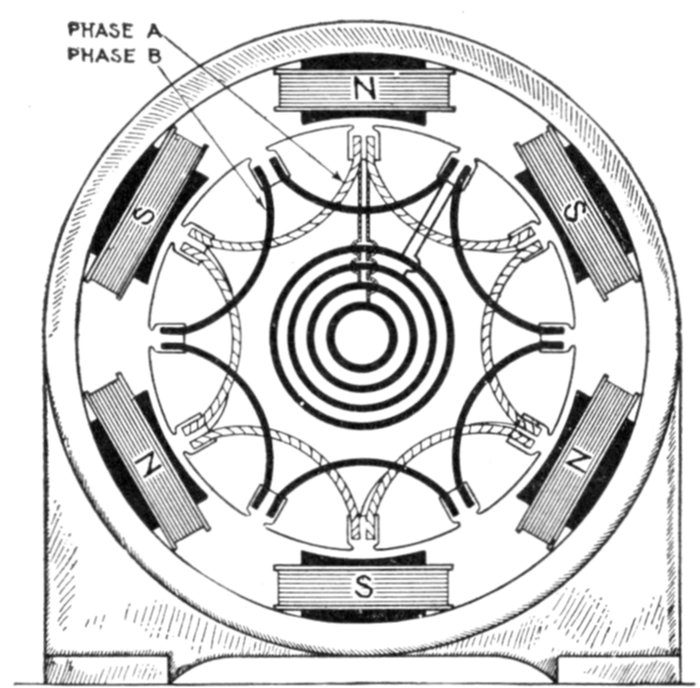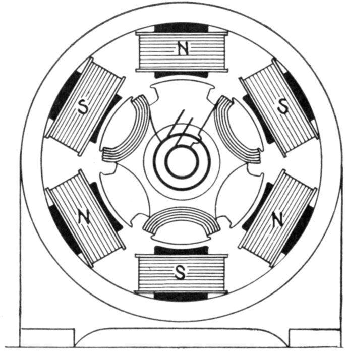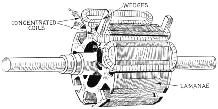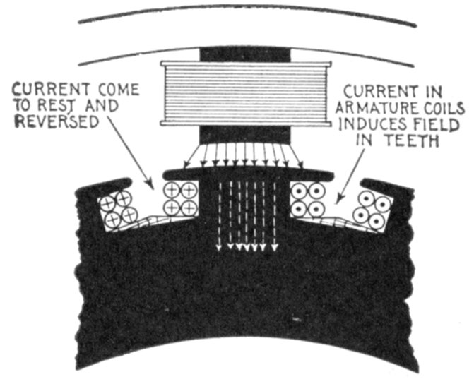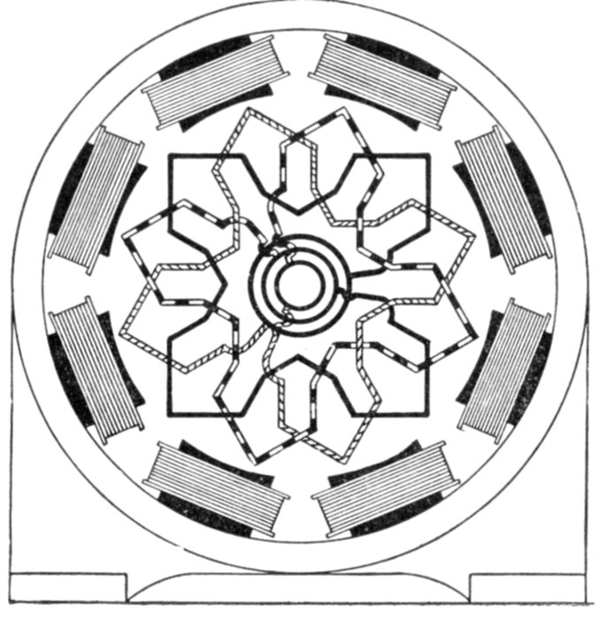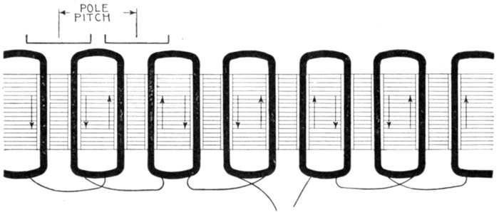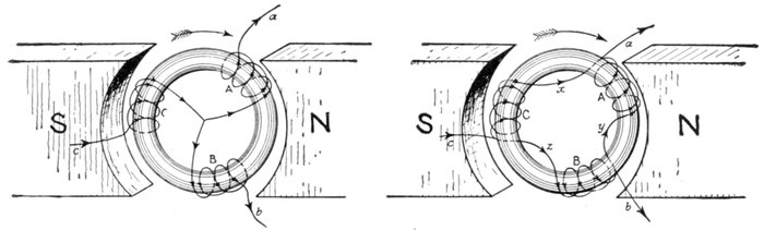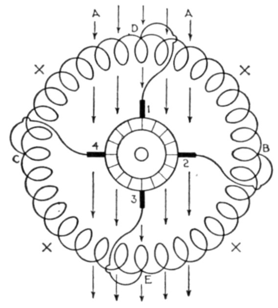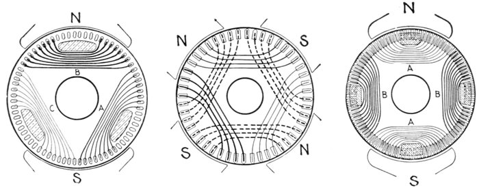 [5] NOTE.—In the star connected armature the proper ends to connect to the common terminal or star point are determined as follows: Assume that the inductor opposite the middle of a pole is carrying the maximum current, and mark its direction by an arrow. Then the current in the inductors on either side of and adjacent to it will be in the same direction. As the maximum current must be coming from the common terminal, the end toward which the arrow points must be connected to one of the rings, while the other end is connected to the common terminal. The current in the two adjacent inductors evidently must be flowing into the common terminal, hence the ends toward which the arrows point must be connected to the common terminal, while their other ends are connected to the remaining two rings.