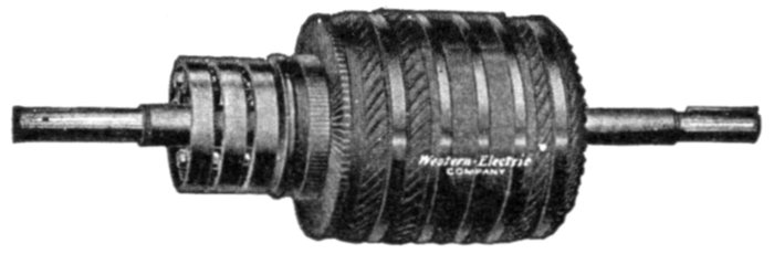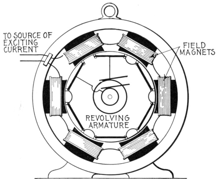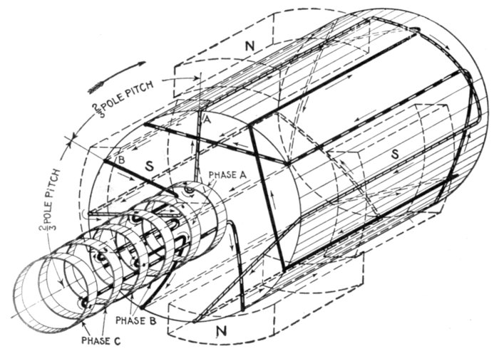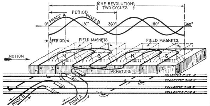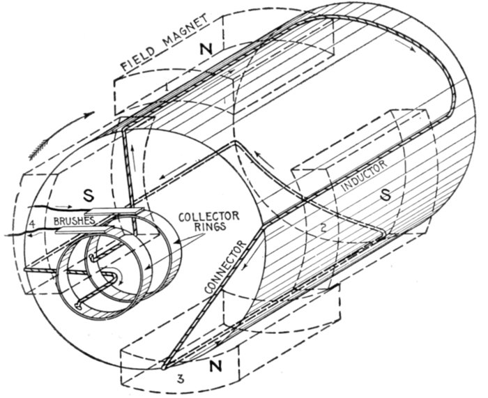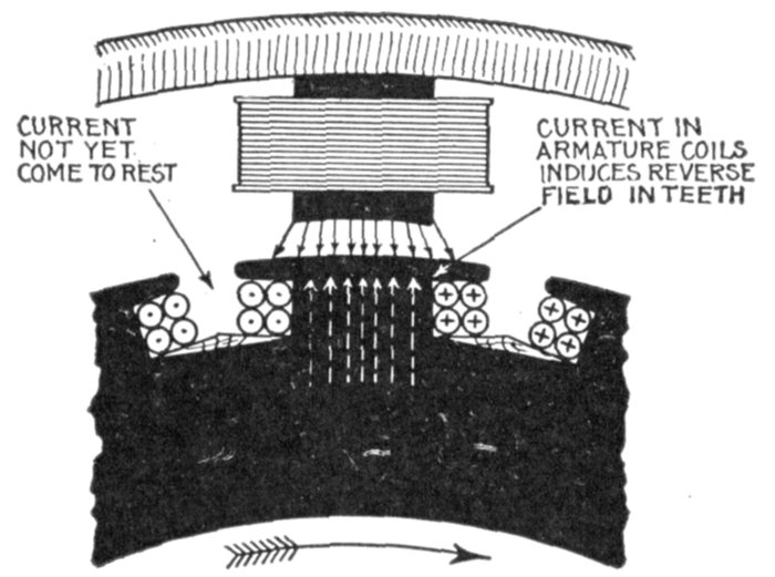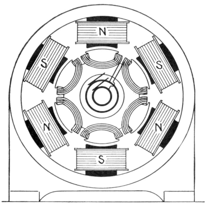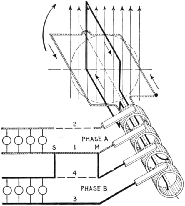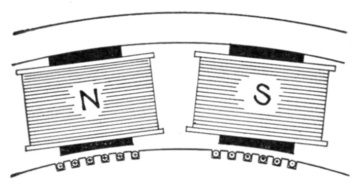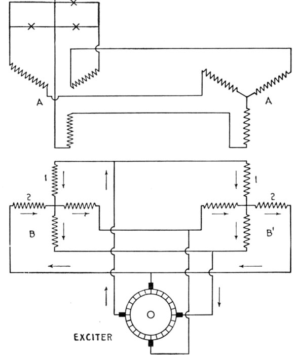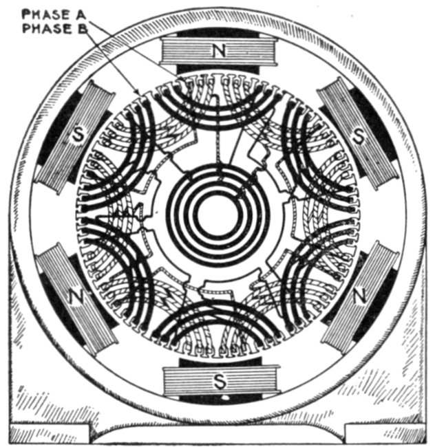 [5] NOTE.—In the star connected armature the proper ends to connect to the common terminal or star point are determined as follows: Assume that the inductor opposite the middle of a pole is carrying the maximum current, and mark its direction by an arrow. Then the current in the inductors on either side of and adjacent to it will be in the same direction. As the maximum current must be coming from the common terminal, the end toward which the arrow points must be connected to one of the rings, while the other end is connected to the common terminal. The current in the two adjacent inductors evidently must be flowing into the common terminal, hence the ends toward which the arrows point must be connected to the common terminal, while their other ends are connected to the remaining two rings.