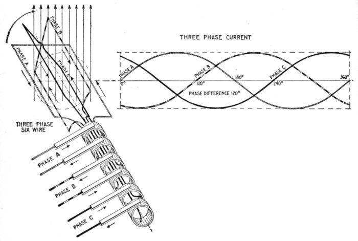 | The word "alternating"—advantages of alternating current—direct current apparatus; alternating current apparatus—disadvantages of alternating current—alternating current principles—the sine—application and construction of the sine curve—illustrated definitions: cycle, alternation, amplitude, period, periodicity, frequency—commercial frequencies—advantages of low frequency—phase—phase difference—phase displacement—synchronism—"in phase"—curves illustrating "in phase" and "out of phase"—illustrated definitions: in phase; in quadrature, current leading; in quadrature, current lagging; in opposition—maximum volts and amperes—average volts and amperes—elementary alternator developing one average volt—virtual volts and amperes—effective volts and amperes—relation between shape of wave and form factor—wave form—oscillograph wave form records—what determines wave form—effect of one coil per phase per pole—single phase current; hydraulic analogy—two phase current; hydraulic analogy—two phase current distribution—three phase current; hydraulic analogy; distribution—inductance—the henry—inductive and non-inductive coils—hydraulic analogy of inductance—inductance coil calculations—ohmic value of inductance—capacity: hydraulic analogy—the farad—specific inductive capacity—condenser connections—ohmic value of capacity—lag and lead—mechanical analogy of lag—lag measurement—steam engine analogy of current flow at zero pressure—reactance—examples—choking coil—impedance curve—resonance—critical frequency—skin effect.[Pg iv] | |
