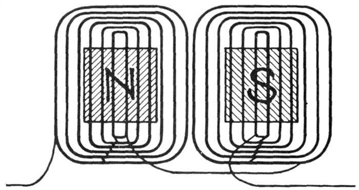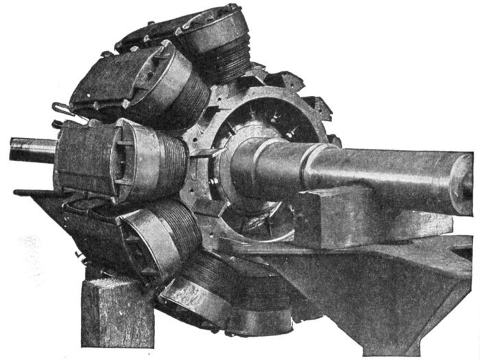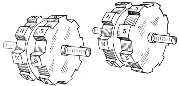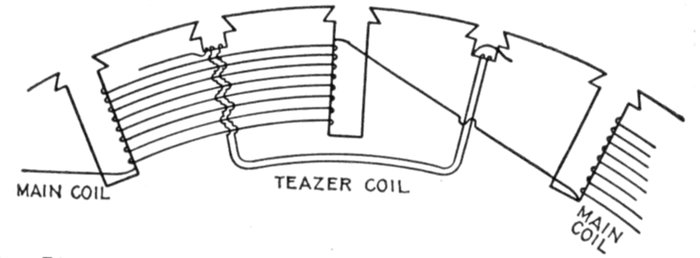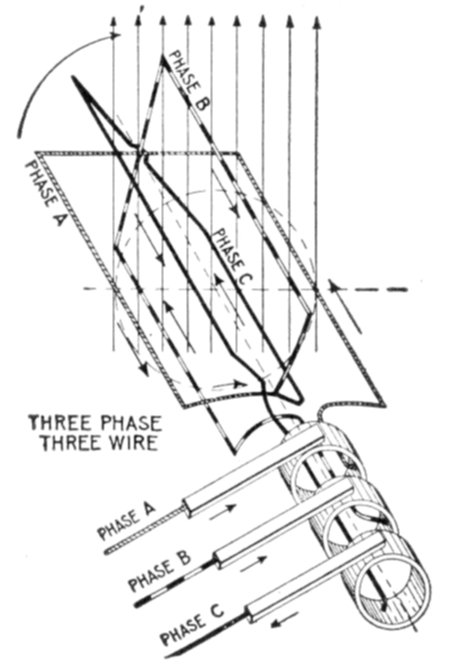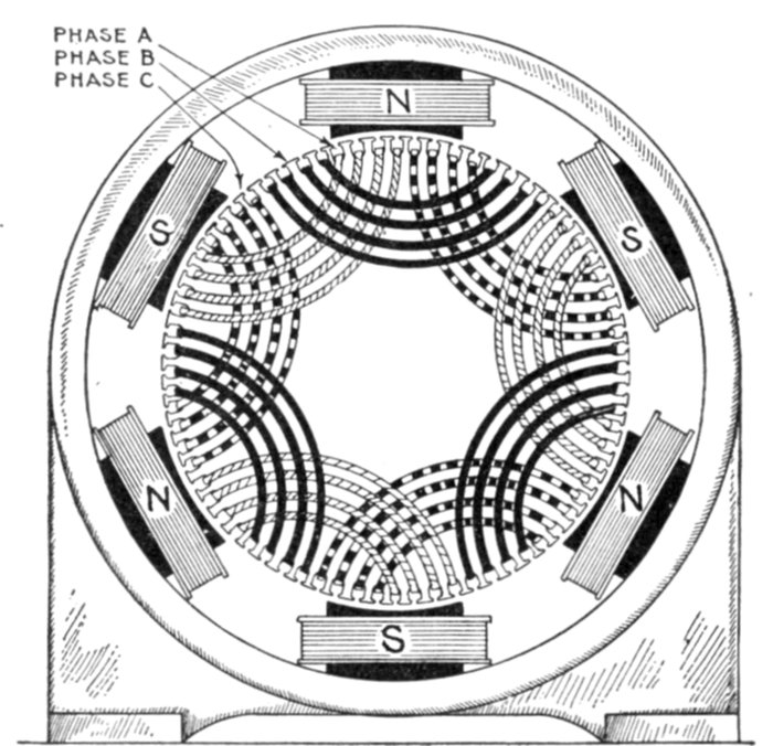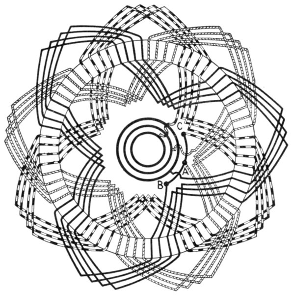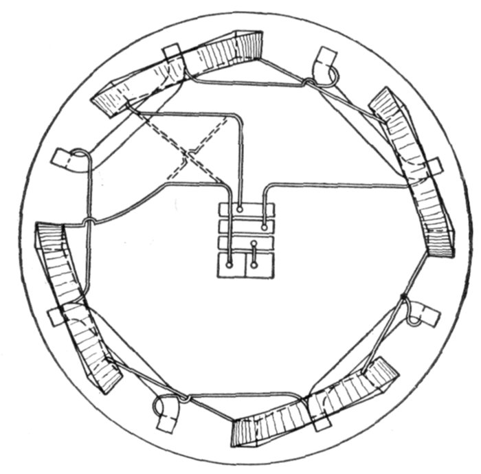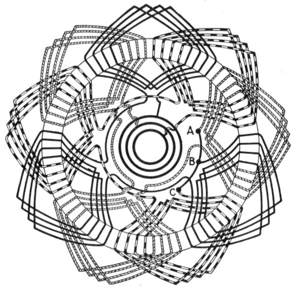 Now of these 9 coils, any three contiguous ones are nearly in phase, if wound alternately clockwise and counter-clockwise.