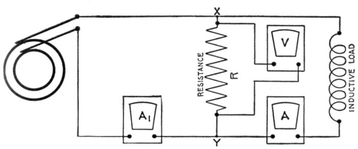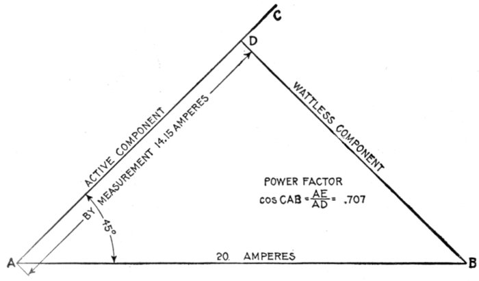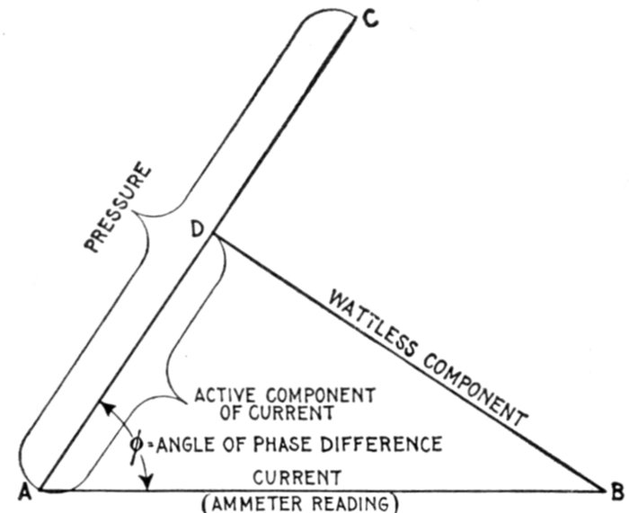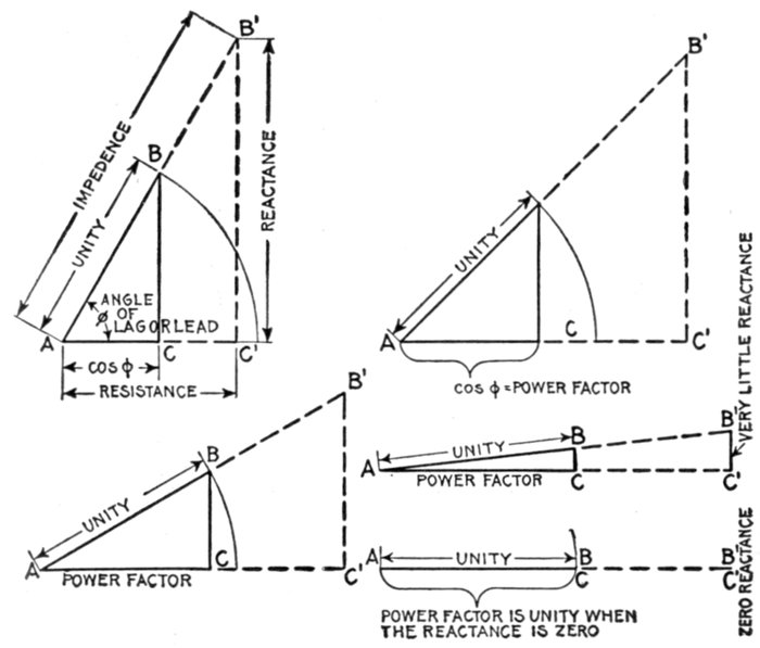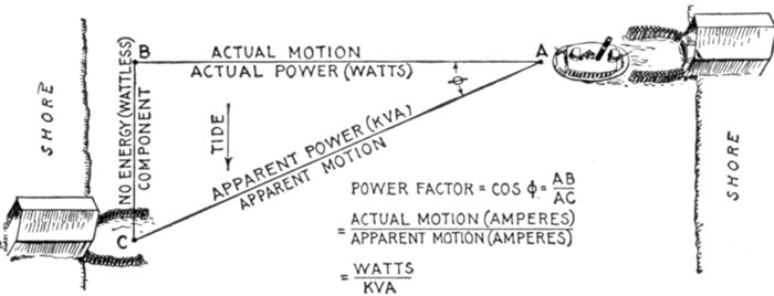 | Definition of power factor—true watts—- apparent watts—ferry boat analogy of power factor—limits of power factor—effect of lag or lead—how to obtain the power curve—nature of the power curve—synchronism of current and pressure; power factor unity—case of synchronism of current and pressure with power factor less than unity—steam engine analogy of power factor—"wattless current;" power factor zero—examples of phase difference nearly 90 degrees—mechanical analogy of wattless current—why the power factor is equal to cos φ—graphical method of obtaining the active component—examples and diagrams—effect of capacity—diagrams illustrating why the power factor is unity when there is no resultant reactance in the circuit—usual value of power factor—power factor test—how alternators are rated; kva.—curves illustrating power factor—how to keep the power factor high—why power factor is important in station operation—wattmeter method of three phase power measurement. | |