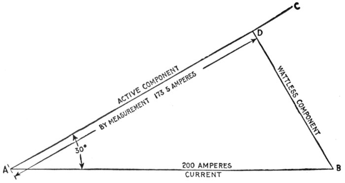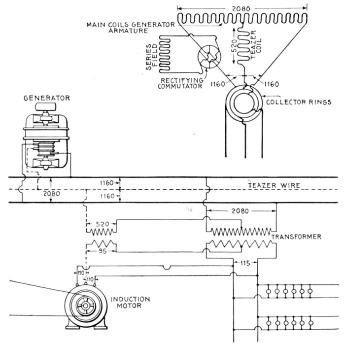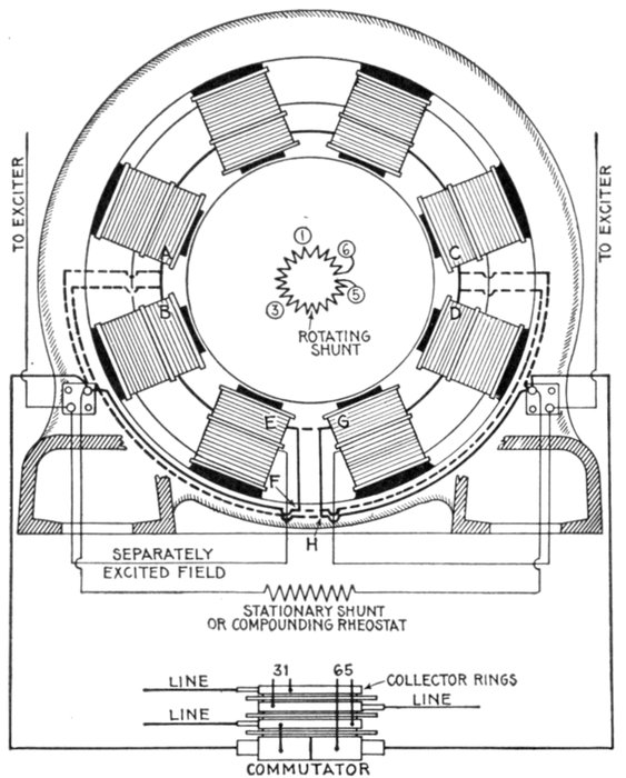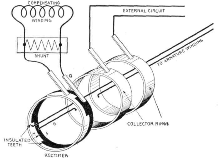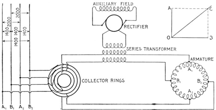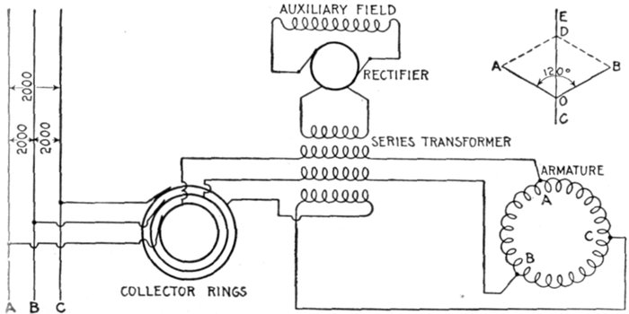 Fig. 1,558.—Diagram of Westinghouse two phase composite wound alternator, showing connections between two phase armature and a single phase rectified and composite field winding. The arrangement makes use of a series transformer, mounted on the spokes of the armature. By means of this series transformer the voltage delivered to the rectifying commutator and the fields is much less than that generated by the machine. The armature of this machine is of the closed coil single winding type, all the armature inductors being connected with each other to form a closed circuit which resembles to a certain extent the ordinary drum winding of a multipolar direct current machine. This winding is tapped out at two points per pole just as is the continuous winding of a two phase rotary converter, these taps running to collector rings through which the currents are delivered to the outside circuits. On account of this connection of both phases to one winding there is a definite voltage set up between the inductors of phase A, and of phase B, this voltage being shown by the figures given in the diagram. The arrangement is adapted for two phase work by fitting the series transformer for the auxiliary field excitation with two primaries connected respectively in one leg of each of the two phases; thus the transformer is excited by two currents normally ¼ period out of phase with each other. The result upon the secondary is a combination of the effects of the two primary currents, the voltage delivered by the secondary being intermediate in phase between those pressures which would be separately set up by the two primaries. This combination effect is shown in the small diagram in the upper right hand corner of the illustration. If OA be the effect set up in the secondary of the series transformer by the primary current of phase A, and OB be the effect set up by the primary current of phase B, OC represents in magnitude and phase relation the resultant effect upon the secondary. It is readily seen that this resultant is not equal to the arithmetical sum of the two components since, to a certain extent, they work at cross purposes. However, if either one of them increase the resultant effect increases, although not in exact proportion. If the load remain balanced, the two components remaining equal to each other, the resultant OC varies in exact proportion to any changes in the components. If the load become unbalanced, the resultant swings around more nearly into phase with the larger load; thus if OB become greater, OA remaining the same, OC swings around, becoming more nearly horizontal. This requires a readjustment of the position of the brushes on the commutator to set them properly for minimum sparking, an adjustment exactly similar to that required when the power factor of the load changes.