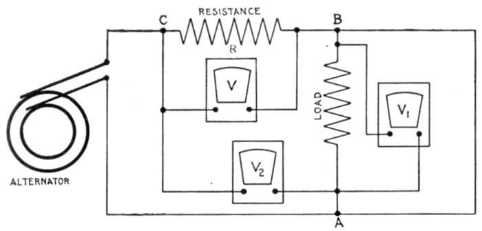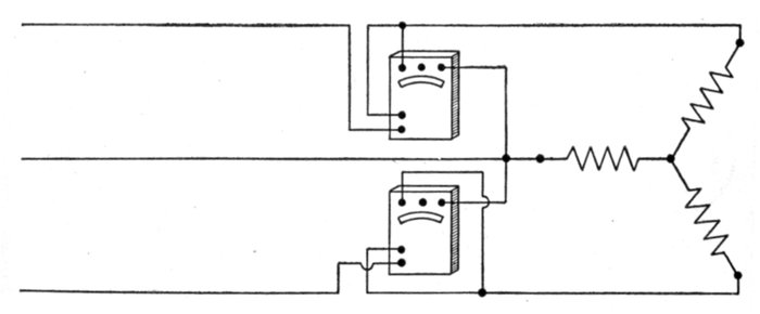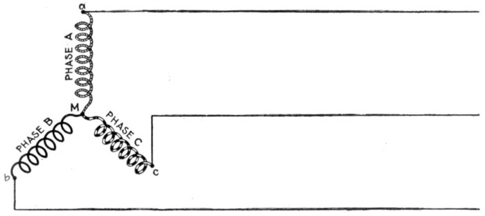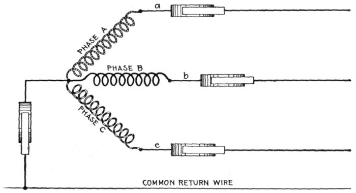 Fig. 1,562.—Diagram of Y connection with a common return wire. When the three lines leading from a, b and c are equal in resistance and reactance, or in other words when the system is balanced, the currents of the three phases are equal and are 120° apart in phase (each current lagging behind its pressure by the same amount as the others) and their sum is at each instant equal to zero. In this case the resultant current being equal to zero there is no need of a common return wire. However, in some cases, where power is distributed from transformers or three wire systems, the different branches are liable to become unbalanced. Under such circumstances the common return wire is sometimes used, being made large enough to take care of the maximum unbalancing that may occur in operation. The return wire is used sometimes on alternators that furnish current mostly for lighting work.