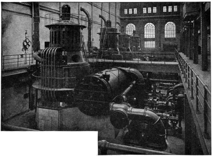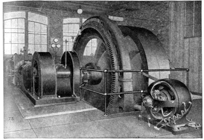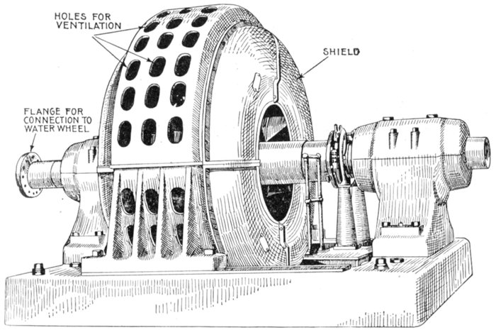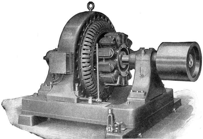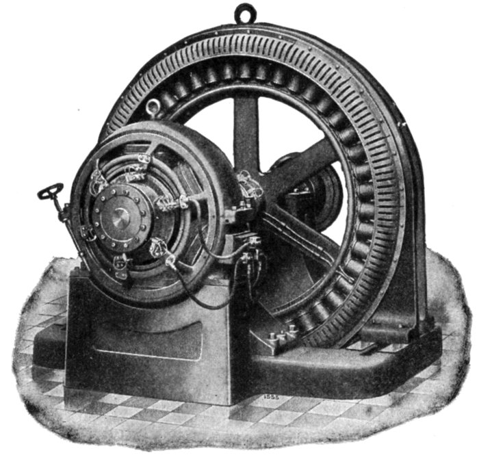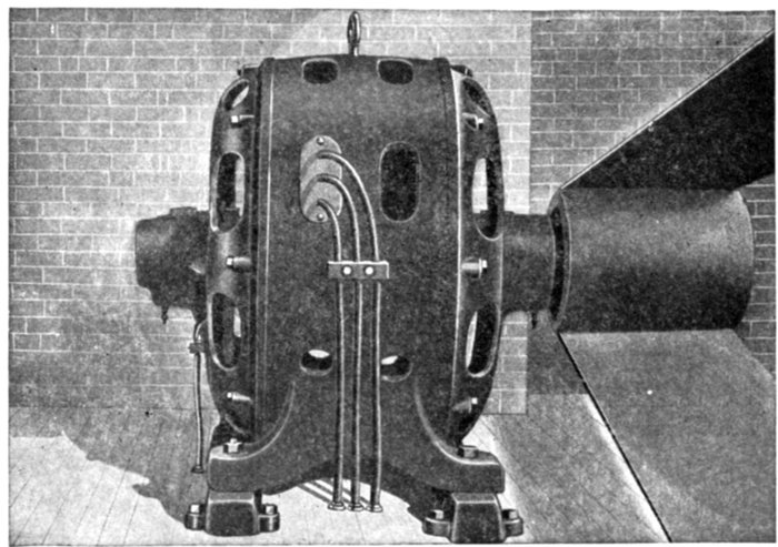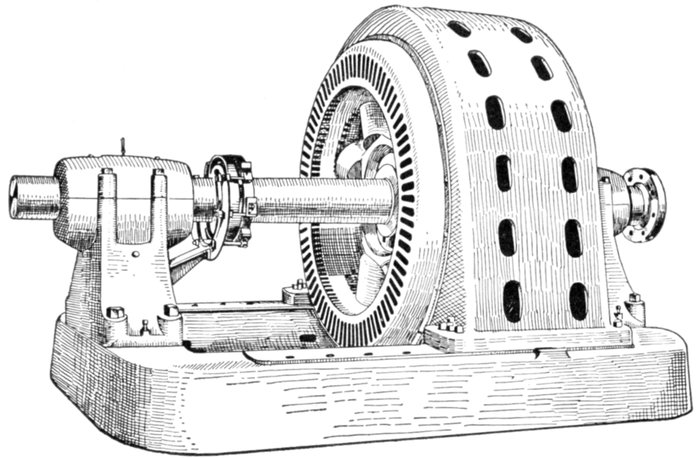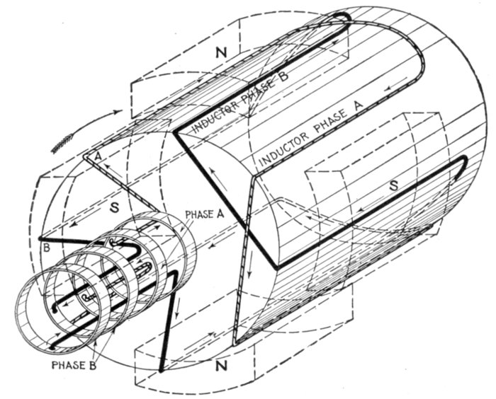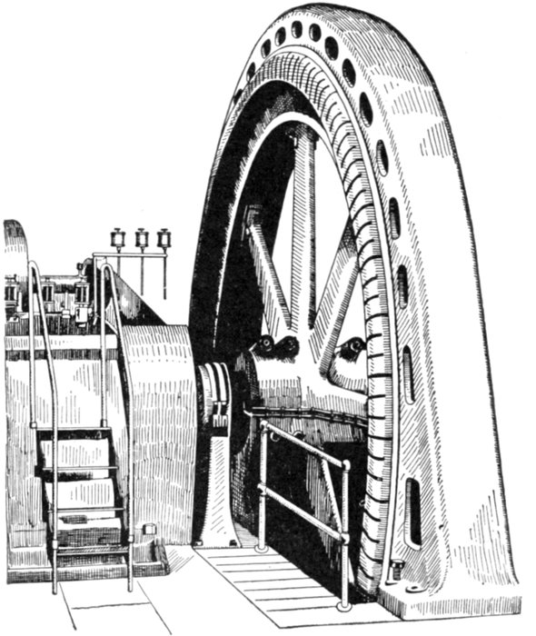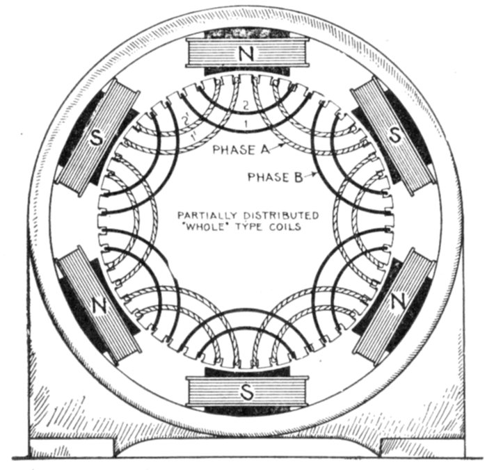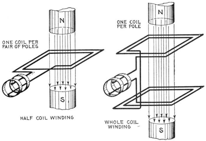 Turbine Alternator Winding.—For the reason that steam turbines run at so much higher speed than steam engines, the construction of armatures and windings for alternators intended to be direct connected to turbines must be quite different from those driven by steam engines. Accordingly, in order that the frequency be not too high, turbine driven alternators must have very few poles—usually two or four, but rarely six.